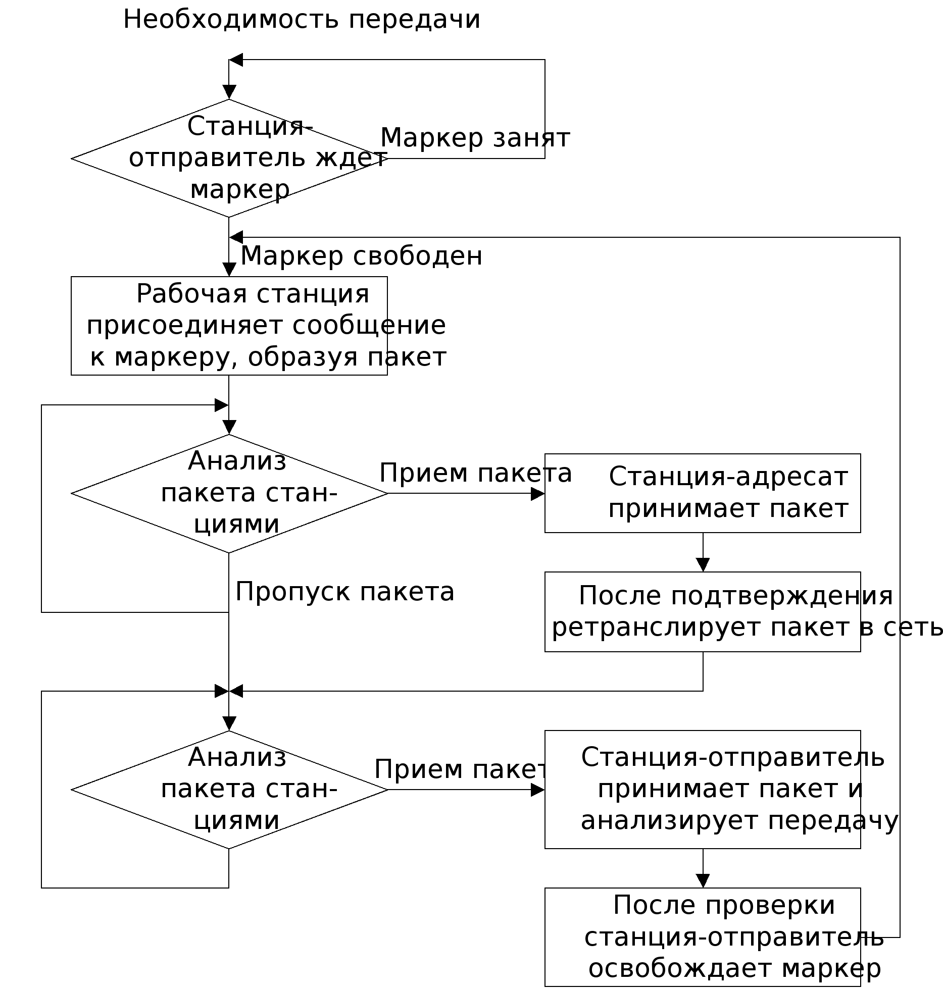 Рис. 4.19 Алгоритм TPMA Метод с передачей маркера – это метод доступа к среде, в котором от рабочей станции к рабочей станции передается маркер, дающий разрешение на передачу сообщения. При получении маркера рабочая станция может передавать сообщение, присоединяя его к маркеру, который переносит это сообщение по сети. Каждая станция между передающей станцией и принимающей видит это сообщение, но только станция – адресат принимает его. При этом она создает новый маркер. Маркер (token), или полномочие, – уникальная комбинация битов, позволяющая начать передачу данных. Каждый узел принимает пакет от предыдущего, восстанавливает уровни сигналов до номинального уровня и передает дальше. Передаваемый пакет может содержать данные или являться маркером. Когда рабочей станции необходимо передать пакет, ее адаптер дожидается поступления маркера, а затем преобразует его в пакет, содержащий данные, отформатированные по протоколу соответствующего уровня, и передает результат далее по ЛВС. Пакет распространяется по ЛВС от адаптера к адаптеру, пока не найдет своего адресата, который установит в нем определенные биты для подтверждения того, что данные достигли адресата, и ретранслирует его вновь в ЛВС. После чего пакет возвращается в узел из которого был отправлен. Здесь после проверки безошибочной передачи пакета, узел освобождает ЛВС, выпуская новый маркер. Таким образом, в ЛВС с передачей маркера невозможны коллизии (конфликты). Метод с передачей маркера в основном используется в кольцевой топологии. Данный метод характеризуется следующими достоинствами: