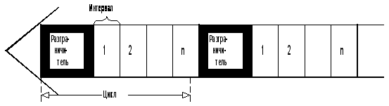 TDMAМножественный доступ с разделением во времени основан на распределении времени работы канала между системами (рис.4.7). Доступ TDMA основан на использовании специального устройства, называемого тактовым генератором. Этот генератор делит время канала на повторяющиеся циклы. Каждый из циклов начинается сигналом Разграничителем. Цикл включает n пронумерованных временных интервалов, называемых ячейками. Интервалы предоставляются для загрузки в них блоков данных.