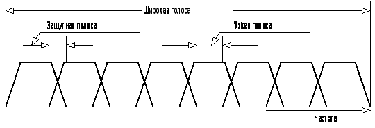 Рис. 4.20 Структура множественного доступа с разделением во времени Данный способ позволяет организовать передачу данных с коммутацией пакетов и с коммутацией каналов. Первый (простейший) вариант использования интервалов заключается в том, что их число (n) делается равным количеству абонентских систем, подключенных к рассматриваемому каналу. Тогда во время цикла каждой системе предоставляется один интервал, в течение которого она может передавать данные. При использовании рассмотренного метода доступа часто оказывается, что в одном и том же цикле одним системам нечего передавать, а другим не хватает выделенного времени. В результате – неэффективное использование пропускной способности канала. Второй, более сложный, но высокоэкономичный вариант заключается в том, что система получает интервал только тогда, когда у нее возникает необходимость в передаче данных, например при асинхронном способе передачи. Для передачи данных система может в каждом цикле получать интервал с одним и тем же номером. В этом случае передаваемые системой блоки данных появляются через одинаковые промежутки времени и приходят с одним и тем же временем запаздывания. Это режим передачи данных с имитацией коммутации каналов. Способ особенно удобен при передаче речи. FDMAДоступ FDMA основан на разделении полосы пропускания канала на группу полос частот (Рис. 4.8), образующих логические каналы. Широкая полоса пропускания канала делится на ряд узких полос, разделенных защитными полосами. Размеры узких полос могут быть различными. При использовании FDMA, именуемого также множественным доступом с разделением волны WDMA, широкая полоса пропускания канала делится на ряд узких полос, разделенных защитными полосами. В каждой узкой полосе создается логический канал. Размеры узких полос могут быть различными. Передаваемые по логическим каналам сигналы накладываются на разные несущие и поэтому в частотной области не должны пересекаться. Вместе с этим, иногда, несмотря на наличие защитных полос, спектральные составляющие сигнала могут выходить за границы логического канала и вызывать шум в соседнем логическом канале.