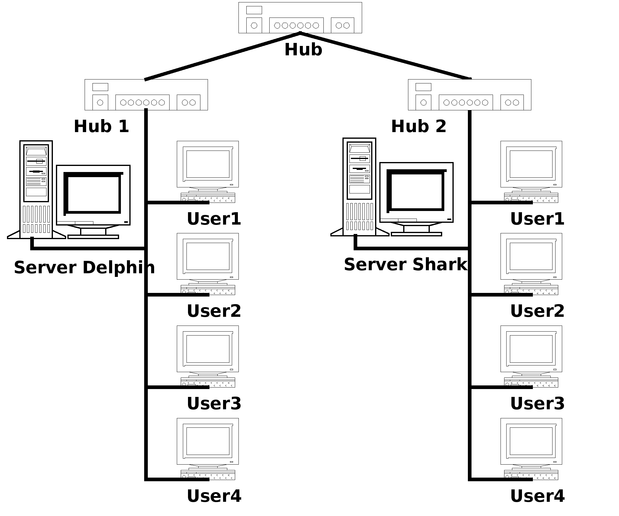 Рис. 7.26 Одноранговая сеть Если выполнение каких-либо серверных функций является основным назначением компьютера, то такой компьютер называется выделенным сервером. В зависимости от того, какой ресурс сервера является разделяемым, он называется файл–сервером, факс–сервером, принт–сервером, сервером приложений, сервером БД, Web–сервером и т. д. На выделенных серверах устанавливается ОС для выполнения тех или иных серверных функций. Выделенный сервер не принято использовать в качестве компьютера для выполнения текущих задач, не связанных с его основным назначением, так как это может уменьшить производительность его работы как сервера. В одноранговых сетях все компьютеры равны в правах доступа к ресурсам друг друга. Каждый пользователь может по своему желанию объявить какой-либо ресурс своего компьютера разделяемым, после чего другие пользователи могут его эксплуатировать. В таких сетях на всех компьютерах устанавливается одна и та же ОС, которая предоставляет всем компьютерам в сети потенциально равные возможности. Одноранговые сети могут быть построены, например, на базе ОС LANtastic, Personal Ware, Windows for Workgroup, Windows NT Workstation. Одноранговые сети проще в организации и эксплуатации. Но они применяются в основном для объединения небольших групп пользователей, не предъявляющих больших требований к объемам хранимой информации, ее защищенности от несанкционированного доступа и к скорости доступа. При повышенных требованиях к этим характеристикам более подходящими являются сети с выделенными серверами, где сервер лучше решает задачу обслуживания пользователей своими ресурсами, так как его аппаратура и сетевая операционная система специально спроектированы для этой цели.
