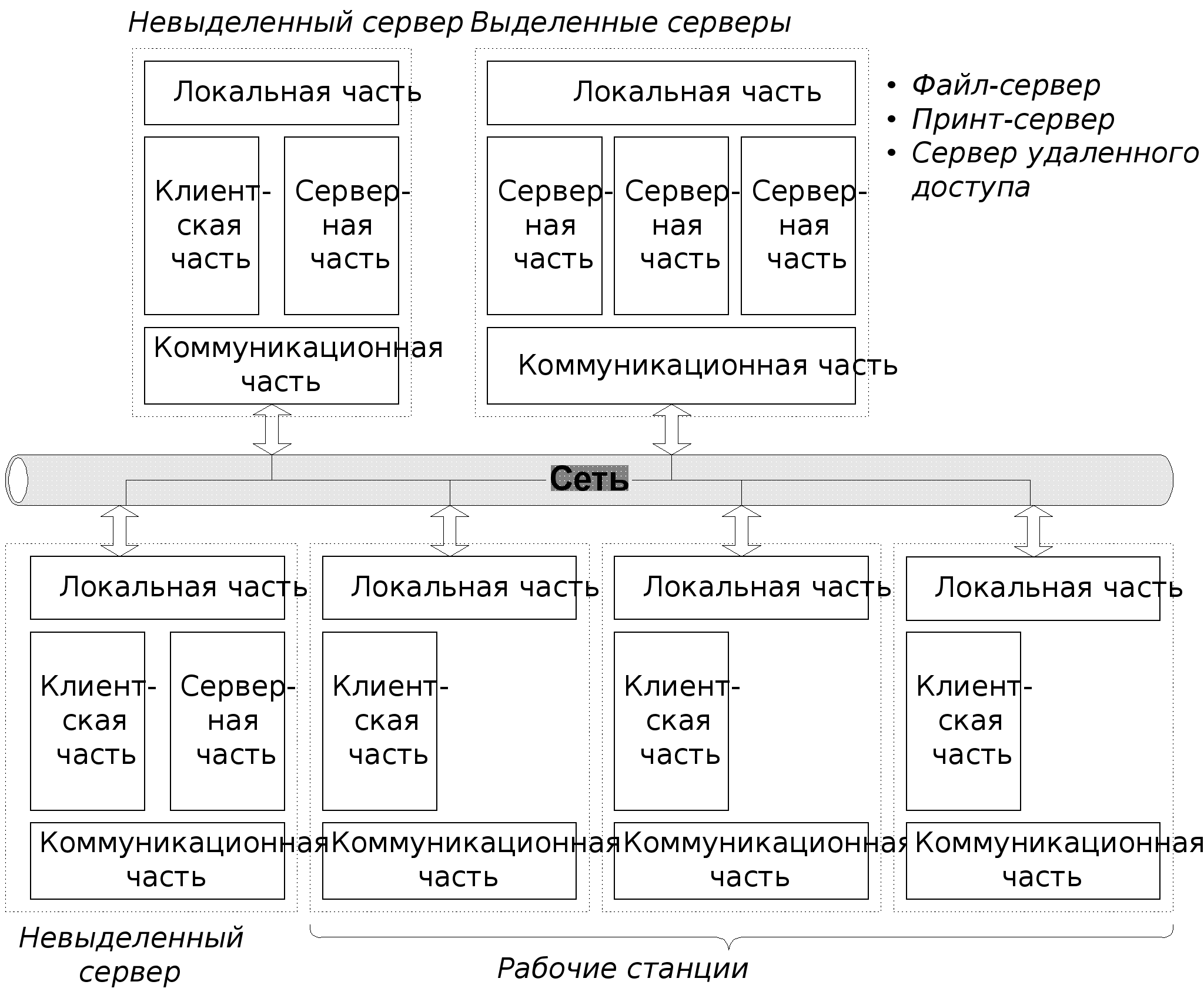 Рис. 7.27 Клиент серверная сеть В сетях с выделенными серверами чаще всего используются сетевые операционные системы, в состав которых входит нескольких вариантов ОС, отличающихся возможностями серверных частей. Например, сетевая операционная система Novell NetWare имеет серверный вариант, оптимизированный для работы в качестве файл-сервера, а также варианты оболочек для рабочих станций с различными локальными ОС, причем эти оболочки выполняют исключительно функции клиента. Другим примером ОС, ориентированной на построение сети с выделенным сервером, является операционная система Windows NT. В отличие от NetWare, оба варианта данной сетевой ОС – Windows NT Server (для выделенного сервера) и Windows NT Workstation (для рабочей станции) - могут поддерживать функции и клиента и сервера. Но серверный вариант Windows NT имеет больше возможностей для предоставления ресурсов своего компьютера другим пользователям сети, так как может выполнять более широкий набор функций, поддерживает большее количество одновременных соединений с клиентами, реализует централизованное управление сетью, имеет более развитые средства защиты. Тема 3.NOS для сетей масштаба предприятияСетевые операционные системы имеют разные свойства в зависимости от того, предназначены они для сетей масштаба рабочей группы (отдела), для сетей масштаба кампуса или для сетей масштаба предприятия. Сети отделов используются небольшой группой сотрудников, решающих общие задачи. Главной целью сети отдела является разделение локальных ресурсов, таких как приложения, данные, лазерные принтеры и модемы. Сети отделов обычно не разделяются на подсети. Сети кампусов соединяют несколько сетей отделов внутри отдельного здания или одной территории предприятия. Эти сети являются все еще локальными сетями, хотя и могут покрывать территорию в несколько квадратных километров. Сервисы такой сети обеспечивают взаимодействие между сетями отделов, доступ к базам данных предприятия, доступ к факс–серверам, высокоскоростным модемам и высокоскоростным принтерам. Сети предприятия (корпоративные сети) объединяют все компьютеры всех территорий отдельного предприятия. Они могут покрывать город, регион или даже континент. В таких сетях пользователям предоставляется доступ к информации и приложениям, находящимся в других рабочих группах, отделах, подразделениях и штаб-квартирах корпорации. Сети отделовГлавной задачей операционной системы, используемой в сети масштаба отдела, является организация разделения ресурсов, таких как приложения, данные, лазерные принтеры и, возможно, низкоскоростные модемы. Обычно сети отделов имеют один или два файловых сервера и не более чем 30 пользователей. Задачи управления на уровне отдела относительно просты. В задачи администратора входит добавление новых пользователей, устранение простых отказов, инсталляция новых узлов и установка новых версий программного обеспечения. Операционные системы сетей отделов хорошо отработаны и разнообразны, так же, как и сами сети отделов, уже давно применяющиеся и достаточно отлаженные. Такая сеть обычно использует одну или максимум две сетевые ОС. Чаще всего это сеть с выделенным сервером NetWare или Windows NT, или же одноранговая сеть, например сеть Windows for Workgroups. Сети кампусовОперационная система, работающая в сети кампуса, должна обеспечивать для 