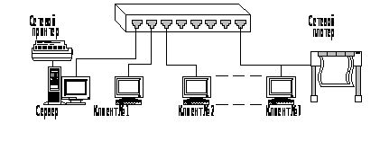 Рис. 1.2 Использование периферийного оборудования С помощью сетей можно разделять ресурсы и информацию. Ниже перечислены основные задачи, которые решаются с помощью рабочей станции в сети, и которые трудно решить с помощью отдельного компьютера: Компьютерная сеть позволит совместно использовать периферийные устройства, включая: