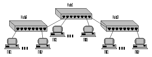 Рис. 9.34 Логический сегмент, построенный с использованием концентраторов Концентраторы образуют из отдельных физических отрезков кабеля общую среду передачи данных – логический сегмент. Логический сегмент также называют доменом коллизий, поскольку при попытке одновременной передачи данных любых двух компьютеров этого сегмента, хотя бы и принадлежащих разным физическим сегментам, возникает блокировка передающей среды. Следует особо подчеркнуть, что, какую бы сложную структуру ни образовывали концентраторы, например путем иерархического соединения (рис. 9.2), все компьютеры, подключенные к ним, образуют единый логический сегмент, в котором любая пара взаимодействующих компьютеров полностью блокирует возможность обмена данными для других компьютеров.