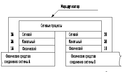 Тема 4.МаршрутизаторМаршрутизатор (router) – ретрансляционная система, соединяющая две коммуникационные сети либо их части. Каждый маршрутизатор реализует протоколы физического (1А, 1B), канального (2А, 2B) и сетевого (3A, 3B) уровней, как показано на рис.9.9. Специальные сетевые процессы соединяют части коммутатора в единое целое. Физический, канальный и сетевой протоколы в разных сетях различны. Поэтому соединение пар коммуникационных сетей осуществляется через маршрутизаторы, которые осуществляют необходимое преобразование указанных протоколов. Сетевые процессы выполняют взаимодействие соединяемых сетей. Маршрутизатор работает с несколькими каналами, направляя в какой-нибудь из них очередной блок данных. Маршрутизаторы обмениваются информацией об изменениях структуры сетей, трафике и их состоянии. Благодаря этому, выбирается оптимальный маршрут следования блока данных в разных сетях от абонентской системы-отправителя к системе-получателю. Маршрутизаторы обеспечивают также соединение административно независимых коммуникационных сетей.