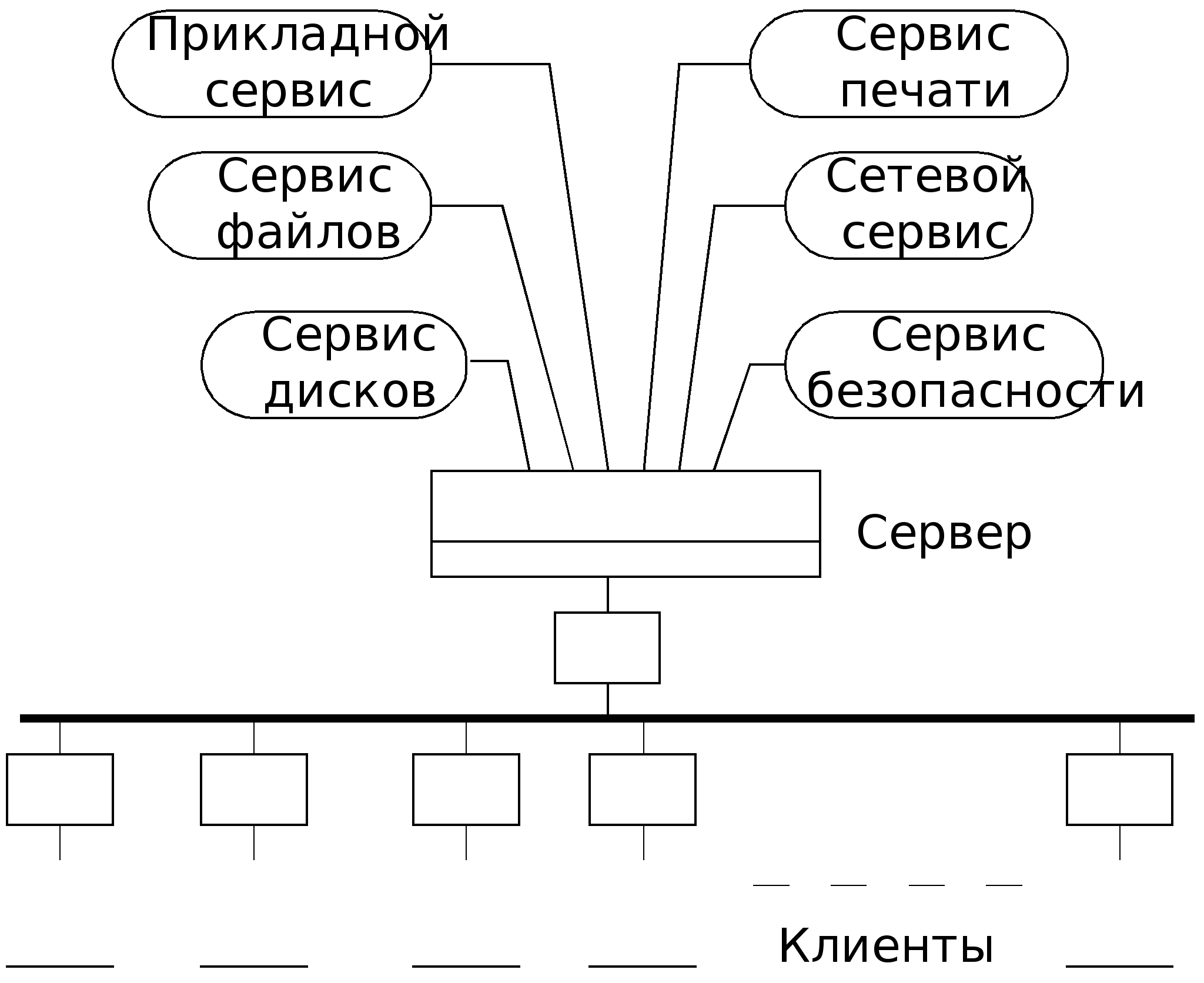 Рис. 1.5 Архитектура клиент – сервер Сервер работает по заданиям клиентов и управляет выполнением их заданий. После выполнения каждого задания сервер посылает полученные результаты клиенту, пославшему это задание. Сервисная функция в архитектуре клиент – сервер описывается комплексом прикладных программ, в соответствии с которым выполняются разнообразные прикладные процессы. Процесс, который вызывает сервисную функцию с помощью определенных операций, называется клиентом. Им может быть программа или пользователь. На рис. 1.6 приведен перечень сервисов в архитектуре клиент – сервер. Клиенты – это рабочие станции, которые используют ресурсы сервера и предоставляют удобные интерфейсы пользователя. Интерфейсы пользователя это процедуры взаимодействия пользователя с системой или сетью. Клиент является инициатором и использует электронную почту или другие сервисы сервера. В этом процессе клиент запрашивает вид обслуживания, устанавливает сеанс, получает нужные ему результаты и сообщает об окончании работы.