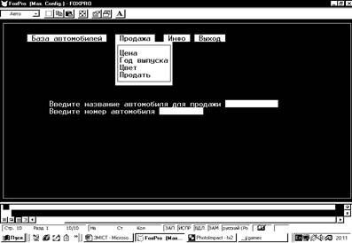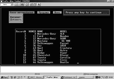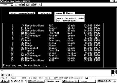 Реферат: Курсовая работа по FoxproРеферат: Курсовая работа по FoxproЗМІСТ1.Вступ………………………………………………………………………………………..2 ст. 2.Що таке бази даних ?............................................................................................................3 ст. 3.Структура представлення даних..........................................................................................4 ст. 4.Опис алгоритму.....................................................................................................................6 ст. 5.Висновок................................................................................................................................7 ст. 6.Листинг-1...............................................................................................................................8 ст. 7.Листинг-2...............................................................................................................................9 ст. 8.Приклади екранних форм...................................................................................................10 ст. 9.Список використаної літератури.......................................................................................11 ст. ВступПоставлене передімною завдання,я виконував на власному персональному комп’ютері з урахуванням пройденного на уроках інформатики матеріалу, а також інших джерел інформації1.Темою своєї роботи я вибрав – облік та продаж автомобілів.Я вважаю,що ця тема дуже актуальна у нашому повсякденному житті. Так , як з розвитком ринкових відносин у нашій країні дуже гостро стоїть проблема автоматизації систем управління.Для цього постійно треба удосконалювати ефективність праці.А це в свою чергу неминуче пов’язано з впровадженням новітніх технологій у виробництво.Найголовніша деталь в усіх видах торгівлі – це облік.Для того, щоб упорядковано його вести, необхідно мати зручні для цієї роботи інструменти.Цими інструментами являються – комп’ютер та програми за допомогою яких ведеться облік роботи підприємства. Жоден облік будь-чого не може вестися без бази данних.Тому на допомогу користувачам створюються програми для роботою з базами даних.На сьогоднішній день їх дуже багато і вони в свою чергу дуже різноманітні , зі своїми специфічними властивостями.Це такі програмні продукти як Excel,Access,Novell db , FoxPro,Paradox та інші програмні продукти. Моя програма не претендуе на звання повністю функціональної робочої системи, а лише описує деякі можливості СУБД .Завдання – показати наскільки зручно оперувати з даними у FoxPro.База даних має нескладний та зручний інтерфейс з яким легко працювати.Повний програмний код, алгоритм та опис процедур описаний у наступних розділах курсової роботи.