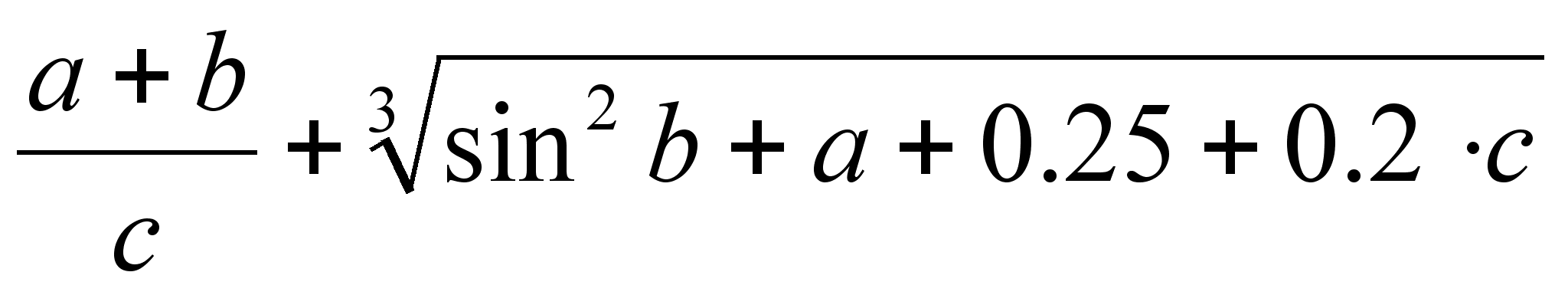 конец INPUT “Введите a, b, c”; a, b, c y=(a+b)/c+(SIN(b)^2+a+0.25+0.2c)^(1/3) PRINT “y=”; y (SIN(x+b)^a(c^2+x^0.7LOG(a))^(115))/(SQR(x+a)+1) ((a^(x+m)COS(x)+SQR((LOG(a+b)/LOG10)^2)/(1+(x+a)^(1/3))