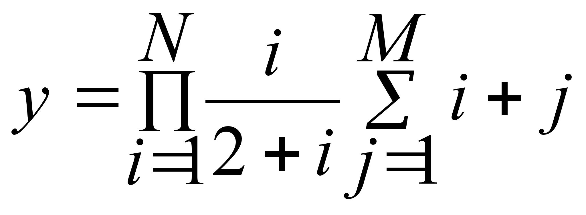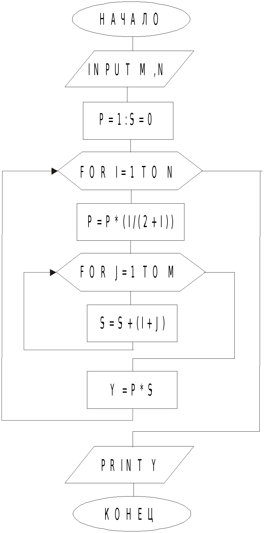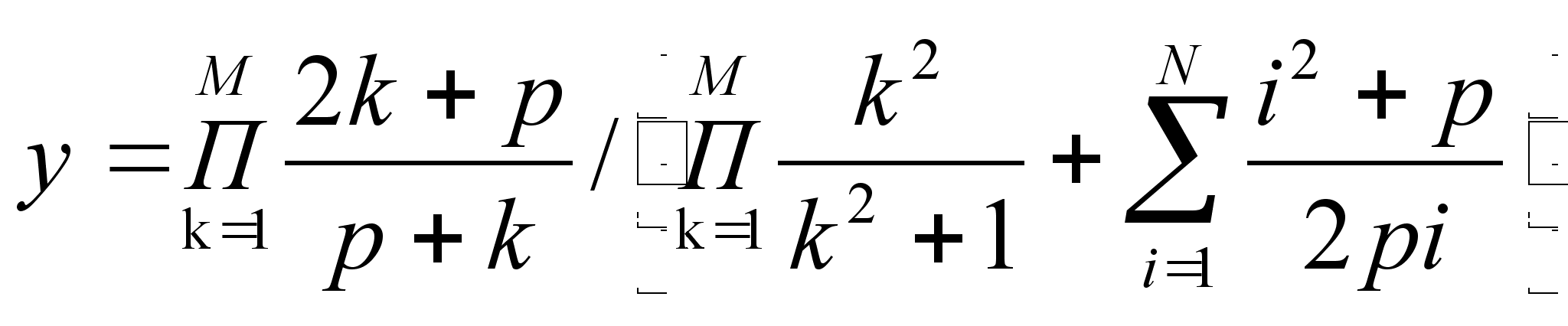 INPUT “Введите M, N, L”; M, N, L P=1 FOR k=1 TO m P=P((2k+L)/(L+k)) NEXT k S=1 FOR k=1 TO m S=S(k^2/(k^2+1)) NEXT k Z=0 FOR i=1 TO n Z=Z+(i^2+L)/(2Li) NEXT i y=P/(S+Z) PRINT “y=”; y