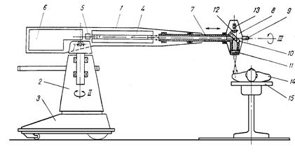 Операционный аппарат состоит из горизонтального ствола 1, установленного на вертикальной стойке 2. Ствол может поворачиваться вокруг горизонтальной оси I и вертикальной оси II. Вертикальная стойка 2 жестко закреплена на платформе 3. Платформа снабжена колесами для перемещения аппарата по полу. К вертикальной стойке прикреплен поручень. Внутри ствола 1 жестко закреплены лазерный излучатель 4, калориметрический блок 5 и блок поджига 6. На конец ствола 1 установлен телескопический вал 7 с поворотно-фокусирующей головкой 8. Телескопический вал 7 можно перемещать вдоль его собственной оси симметрии III и поворачивать вокруг той же оси III вместе с поворотно-фокусирующей головкой 8. Головка 8 жестко закреплена на конце телескопического вала. На нем жестко закреплена и рукоятка 9, охватывающая поворотно-фокусирующую головку 8. Внутри головки 8 жестко зафиксированы селективно отражающее лазерное излучение зеркало 10, фокусирующая линза 11, конденсор 12 и лампочка накаливания 13. Лазерный излучатель 4 выполнен в виде отдельного блока. Активным элементом в нем является стержень из неодимового стекла ПГЛС-1 диаметром 45 мм и длиной 617 мм. Активный элемент возбуждается с помощью четырех ксеноновых ламп накачки ИПФ-20000, расположенных в четырехлепестковом осветителе с четырьмя V-образными отражателями, изготовленными из нержавеющей стали. Внутренние поверхности отражателей полированные и имеют хорошо отражающее серебряное покрытие. Активный элемент расположен в корпусе осветителя вдоль оси симметрии. Корпус осветителя изготовлен из нержавеющей стали. Торцы активного элемента уплотнены в корпусе осветителя с помощью индиевых колец, сжимаемых цилиндрическими держателями зеркал резонатора. Глухое и полупрозрачное зеркала, установленные параллельно торцам активного элемента, герметизирует полости между зеркалом и активным элементом. При этом боковыми стенками полостей являются цилиндрические поверхности держателей зеркал резонатора. Внутренняя полость осветителя, лампы накачки и активный элемент омываются 0.02% раствором K2Cr2O4 в дистиллированной воде, циркулирующей через осветитель. Полупрозрачное зеркало резонатора (коэффициент пропускания 60%) установлено в излучателе 4 со стороны поворотно-фокусирующей головки 8. Глухое зеркало резонатора с коэффициентом пропускания 5% размещено со стороны калориметрического блока 5. Поэтому при генерации лазерного излучения в резонаторе излучателя 4 основная часть излучения направлена в сторону поворотно-фокусирующей головки, а остальная — в сторону калориметрического блока 5, где поглощается его приемной площадкой. Калориметрический блок 5 (после проведения соответствующей калибровки) обеспечивает измерение энергии лазерного излучения, направляемой в сторону поворотно-фокусирующей головки, по поглощенной его приемной площадкой энергии лазерного излучения. Блок поджига 6 четырехсекционный. Каждая его секция предназначена для поджига одной из ламп накачки лазерного излучателя. Регулирование размеров пятен лазерного излучения на объекте облучения осуществляется в операционном аппарате изменением расстояния между линзой 11 поворотно-фокусирующей головки и объектом облучения, а контроль размеров пятен ведется по системе подсветки. Накопитель энергии установки — электрические емкости, об