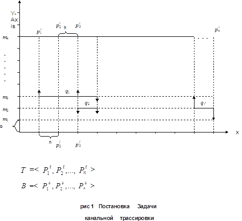 Выделим подмножества Plij,Ptij,j=1,f,i=1,f,Plj,Pti¹0}, каждое из которых составлено из Plj и Pti равных между собой, т.е. соответствующих одной цепи (f- число цепей). На их основе сформируем множество отрезков Q={q1,q2,...,qn}левые координаты которых равны минимальной координате PljÚPti из соответствующего подмножеcтва Pi-Xq1i=min Хрi, а правые координаты-максимальной координате P1jÚPtj-Xq2i=maxXpi Необходимо распределить qf отрезков по магистралям таким образом, чтобы требуемое для трассировки число магистралей было минимально: mk®min и выполнялось ограничение (1) "(i,j)=1,f:q1*nqj=Æ ( 1) а также ограничения, задаваемые с помощью графа вертикальных ограничений (ГВО), множество вершин которого соответствует Pi,j=1,f ,т.е. соответствует множеству цепей, а две его вершины Pi и Pj соединяются ориентированным ребром, что означает принудительное расположение отрезка qi выше, чем qj в том случае, если "PtijÎTÞ Ptij¹ PlijÎB Следует отметить, что условие (1) несомненно приоритетно по сравнению с другими критериями трассировки (см. рис. 1), однако, может носить и аддитивный и мультипликативный характер. Отметим, что плотность Ui колонки i канала будем называть число горизонтальных сегментов Sqi , пересекающих i ко-лонку. Максимальной плотностью Umax назовем Ui :