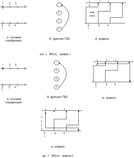 Определение ВК второго типа называется ситуация в исход- ных спецификациях трассировки, когда $qi,qj,i¹j:$PaaiÎqi,$PaajÎqj: a=1,2,…: Xpai= Xpaj и некоторые подмножества , а соответствующие Конфликты третьего типа образуют в соответствующем ГВО цикл, в котором может быть произвольное число вершин больше двух. Определение ВК третьего типа называется ситуация в исходных спецификациях трассировки, когда $q1,q2,…,qn: X1q1=X1q2: X2q2=X1q3 , …,X2qn-1=X1qn , X2qn=X2q1 и одновременно "P1xi, i=2,3,…,nÎL, "P2xi ,i=2,3,…, nÎT , а P1x1ÎT и P2x1ÎL. ВК четвертого типа можно назвать комбинированными, так как они могут включать в один конфликтный узел ГВО одновременно произвольное число конфликтов 1-го, 2-го, 3-го типов. 3.2. Ликвидация ВК на основе технологии ИИ После того, как ВК идентифицирован, необходимо ликвидировать его с помощью применения правил предикатного типа. Такие правила полученые в результате экспертных исследований при трассировке и иерархичеоки организованных БЗ. Общий вид правила следующий: Правило N1 ЕСЛИ (условие) И (условие) И (условие) ТО ( рекомендуемое действие ) ЕСЛИ решение задачи с помощью текущего i -го правила невозможно, т.к. не выполняется какое-либо из его условий, то происходит вызов /i+1/-го правила и так до тех пор, пока не будет получено решение. В противном случае при данном наполнении БЗ получить решение невозможно. Одним из важных достоинств такого подхода является легкая модификация или дополнение правил БЗ, если получена свежая экспертная информация. Таким образом возможна перманентная передача знаний системе трассировки и, как следствие, повышение качества проектирования. Набор правил-продукций должен удовлетворять следующим условиям. Полноты, т.е. возможности получения решения в любом случае с помощью какого-либо из правил. Корректности, т.е. удовлетворение ситуации одному и тому же предварительному условию не должно влечь за собой различных действий для различных правил. Непротиворечивости, т.е. правила не должны противоречить друг другу. Вначале рассмотрим группу правил, предназначенных для ликвидации ВК 1-го и 2-го типов Правило 1 (Правило наложения) Если зона канала между самой левой x1ij/min и самой правой x2ij/max координатами конфликтующих соединений не содерхит других горизонтадьных сегментов. То расположить целиком j и i соединения в разных слоях. Однако, такое правило сравнительно редко может быть применено в реальных задачах. Чаще возможно применение правила 2 Правило 2 Если имеется свободная колонка в зоне между x1ij/min и x2ij/max с координатой Xn3 , То в точке Pxtn3ÎT вводится псевдоконтакт -j и все остальные Pj Î T получают статус -j, а в координате Pxln3ÎL вводится псевдоконтакт j. Таким образом, путем введения "излома" в области конфликта возможна его ликвидация Отметим, что введение излома будет произведено там, где совпадут абсциссы отрезков j и -j в области введения псевдоконтактов. Правило 3 во многом сходно с правилом 2. Однако, в отличие от последнего, поиск свободной колонки осуществляется не в области конфликта, а вне его. При этом поиск производится последовательно слева - справа от зоны конфликта. Таким образом обеспечивается нахождение ближайшей к зоне свободной колонки. Правило 3 Если существует свободная колонка от вертикальных сегментов слева (справа) от зоны ВК с координатой Xn3. И эта колонка ближайшая среди всех свободных колонок в зоне конфликта. То в точке Pxtn3ÎT в