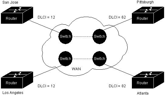 Рис. 2.2.1 Кадр Frame Relay Центром заголовка Frame Relay является 10-битовое значение DLCI. Оно идентифицирует ту логическую связь, которая мультиплексируется в физический канал. В базовом режиме адресации (т.е. не расширенном дополнениями LMI), DLCI имеет логическое значение; это означает, что конечные усторойства на двух противоположных концах связи могут использовать различные DLCI для обращения к одной и той же связи. На рис. 2.2.2 представлен пример использования DLCI при адресации в соответствии с нерасширенным Frame Relay. Рис. 2.2.2 предполагает наличие двух цепей PVC: одна между Aтлантой и Лос-Анджелесом, и вторая между Сан Хосе и Питтсбургом. Лос Анджелес может обращаться к своей PVC с Атлантой, используя DLCI=12, в то время как Атланта обращается к этой же самой PVC, используя DLCI=82. Аналогично, Сан Хосе может обращаться к своей PVC с Питтсбургом, используя DLCI=62. Сеть использует внутренние патентованные механизмы поддержания двух логически значимых идентификаторов PVC различными. В конце каждого байта DLCI находится бит расширенного адреса (ЕА). Если этот бит единица, то текущий байт является последним байтом DLCI. В настоящее время все реализации используют двубайтовый DLCI, но присутствие битов ЕА означает, что может быть достигнуто соглашение об использовании в будущем более длинных DLCI. Бит C/R, следующий за самым значащим байтом DLCI, в настоящее время не используется.