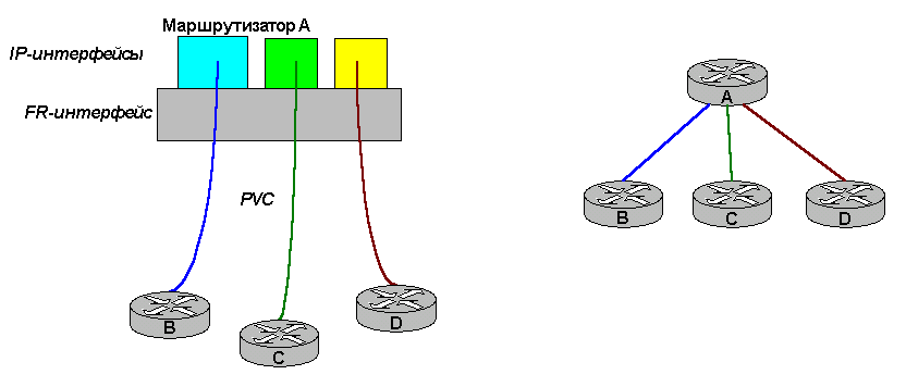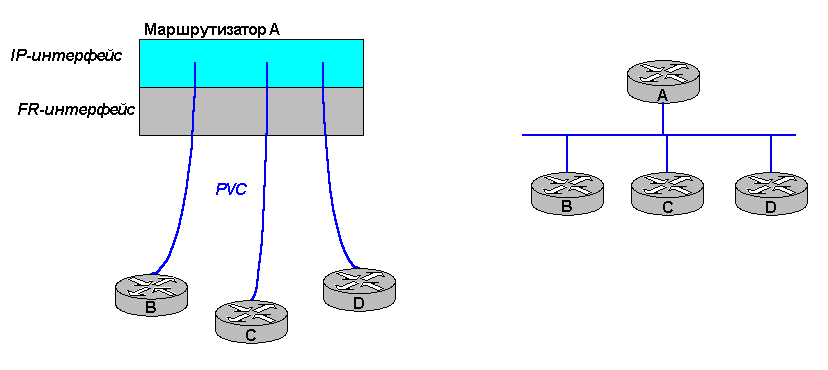 IP-интерфейсы, подключенные к сетям FR, делятся на 2 типа: точка-точка (point-to-point) и точка-много точек (point-to-multipoint). Интерфейс point-to-point позволяет обмениваться пакетами только с одним узлом, а point-to-multipoint - с несколькими. Очевидно, что основной интерфейс (на примере маршрутизатора А) имеет тип point-to-multipoint. На рисунке 4.2.2, слева, изображена организация сетевого уровня на FR-интерфейсе с использованием подынтерфейсов типа point-to-point.
