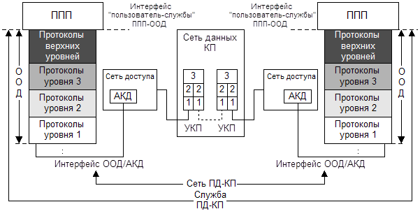 Процесс передачи данных начинается с момента, когда некоторый прикладной процесс пользователя-отправителя создает файл или несколько файлов, которые должны быть отправлены по адресу прикладного процесса пользователя-получателя и дает сигнал на их передачу. С этого момента ППП отправителя начинает взаимодействовать с протоколами верхних уровней ООД отправителя, которые с помощью протоколов нижних уровней передают файлы по сети ПД в ППП получателя. Процесс передачи данных заканчивается, когда файлы оказываются в той области памяти ЭВМ получателя, которая закреплена за ППП адресата.