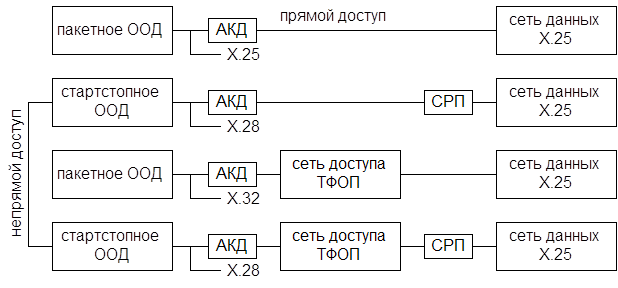 Доступ ООД, рисунок 4, работающих в стартстопном режиме, в сеть ПФ-КП осуществляется через устройство сборки-разборки пакетов – СРП. В зависимости от типа оконечного оборудования – стартстопного (асинхронного) или пакетного (синхронного) – и от типа соединения различают четыре схемы доступа.