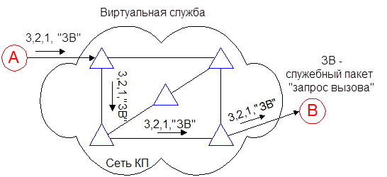 В виртуальной сети абоненту-получателю направляется служебный пакет, прокладывающий виртуальное соединение. В каждом узле этот пакет оставляет распоряжение вида: пакеты k-ого виртуального соединения, пришедшие из i-ого канала следует направлять в j-й канал. Т.о. виртуальное соединение существует только в памяти управляющего компьютера. Дойдя до абонента-получателя, служебный пакет запрашивает у него разрешение на передачу, сообщив какой объем памяти понадобится для приема. Если его компьютер располагает такой памятью и свободен, то посылается согласие абоненту-отправителю на передачу сообщения. Получив подтверждение, абонент-отправитель приступает к передаче сообщения обычными пакетами.
