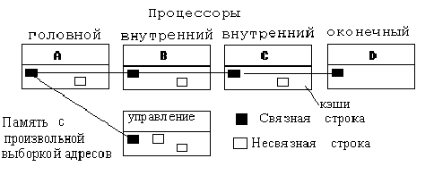 рис.6.Запомининие в кэшах связной кэш-строки при помощи кодов-указателей адресов. Система РСИ-модульная,но не магистральная.Поскольку магистраль общего пользования в ней не понадобилась,из аббревиатуры МММИИУС исчезла одна буква М.Физический облик ММИИУС в стандарте РСИ может быть очень разнообразным:от персональной рабочей станции до суперкомпьютера,содержащего тысячи микропроцессоров,и транспьютеров;от одиночного персонального компьютера в комнате до информационной сети протяженностью десятки километров,объединяющей множество компьютеров и измерительно-управляющих устройств.Для компоновки аппаратурных систем в стандарте определены каналы связи 2х типов.Для передачи сообщений между модулями в стандартизованном каркасе служат 18 параллельных печатных линий на задней плате.Передачи между обособленными узлами выполняются последовательными кодами-по коаксиальному кабелю на расстоянии десятки метров или по оптоволоконному кабелю на километры и более.Скорости передач рекордные:при параллельной передаче 1 Гбайт/сек на частоте 250 МГц,при последовательной-1 Гбит/сек.