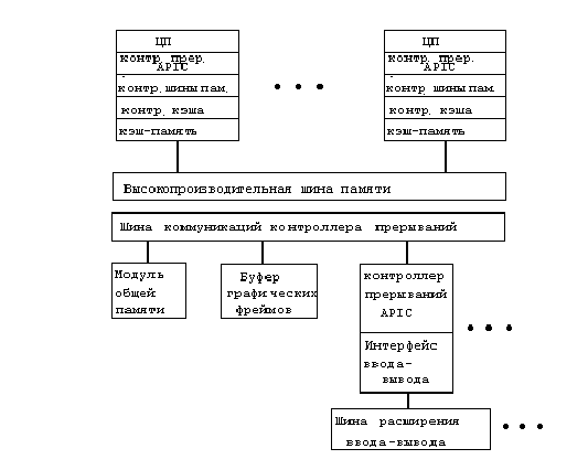 1.ЦП 7.Шины коммуникаций контроллера прерываний 2.Контроллер прерываний APIC 8.Модуль общей памяти 3.Контроллер шины памяти 9.Буфер графических фреймов 4.Контроллеры кэша 10.Контроллер прерываний APIC 5.Кэш-память 11.Интерфейс ввода-вывода 6.Высокопроизводительная шина 12.Шина расширения ввода-вывода памяти Рис8.Архитектура МП-системы. Основные компоненты МП-спецификация определяет системную архитектуру на основе следующих компонентов аппаратуры:системные процессоры, контроллеры APIC,системная память,шина расширения ввода-вывода. Системные процессоры.В целях обеспечения совместимости с существующими программными средствами для PC/AT,спецификация основывается на процессорах семейства Intel 486 или Pentium. Хотя все процессоры в МП-системе функционально идентичны, спецификация выделяет два их типа:загрузочный процессор(BSP) и прикладные процессоры(AP).Какой процессор играет роль загрузочного,определяется аппаратными средствами или совместно аппаратурой и BIOS.Это сделано для удобства и имеет значение только во время инициализации и выключения. BSP-процессор отвечает за инициализацию системы и за загрузку ОС.AP-процессор активизируется после загрузки ОС. Контроллеры APIC.Данные контроллеры обладают распределенной архитектурой,в которой функции управления прерываниями распределены между двумя функциональными блоками:локальным и ввода-вывода.Эти блоки обмениваются информацией через шину,называемую шиной коммуникаций контроллера прерываний(ICC-interrupt communication controller). В МП-системе множество локальных блоков и блоков ввода-вывода могут коллективно использовать одну запись, взаимодействуя через шину ICC.Блоки APIC совместно отвечают за доставку прерывания от источника прерываний до получателей по всей МП-системе. Блоки APIC дополнительно увеличивают расширяемость за счет разгрузки шины памяти от трафика прерываний,а также разделения между процессорами нагрузки по обработке прерываний. Благодаря распределенной архитектуре,локальные блоки или блоки ввода-вывода могут быть реализованы в отдельной микросхеме или интегрированы с другими компонентами системы. Системная память.В системах,совместимых с МП-спецификацией, используется архитектура памяти стандарта AT.Вся память используется как системная за исключением адресов, зарезервированных под устройства ввода-вывода и BIOS. МП-системы нуждаются в значительно более высокой пропускной способности по сравнению с однопроцессорными. Требования возрастают пропорционально числу процессоров на шине памяти.Поэтому спецификация содержит рекомендации использовать кэши второго уровня,призванные снизить трафик по шине и реализующие следующие функции:стратегия обновления с обратной записью и протокол определения согласованности кэшей.От кэшей второго уровня и контроллеров шины памяти требуется,чтобы они были полностью прозрачны для программных средств. Шина расширения ввода-вывода.Спецификация обесречивает построение МП-систем на основе платформ PC/AT,отвечающих промышленным стандартам.В проектах могут быть использованы стандартные шины ISA,EISA,MCA,VL и PCI. BIOS выполняет функции слоя,изолирующего особенности аппаратных средств от ОС и программных приложений. Стандартный однопроцессорный BIOS выполняет следующие функции:проверяет системные компоненты;строит таблицы конфигурации,используемые ОС;и
