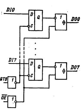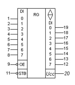 Микросхема КР580ИР83 не содержит инвертирующие выходы. Данная микросхема имеет восемь триггеров D-типа и восемь выходных буферов, имеющих на выходе состояние “Выключено”. Управление передачей информации осуществляется с помощью сигнала STB “Строб”.