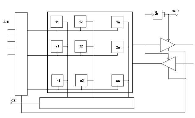 от 256 до 16384 бит со схемами дешифрации.Статические ОЗУ в зависимости от принципа построения накопителя имеют словарную или матричную организацию. При словарной организации ОЗУ обращение производится одновременно к запоминающим элементам нескольких разрядов, соответствующих некоторой части слова или всего слова. Основными достоинствами ОЗУ со словарной организацией является простота базовой ячейки, и минимальное число шин управления, необходимых для реализации накопителя. Важное значение имеет также и то обстоятельство, что при словарной