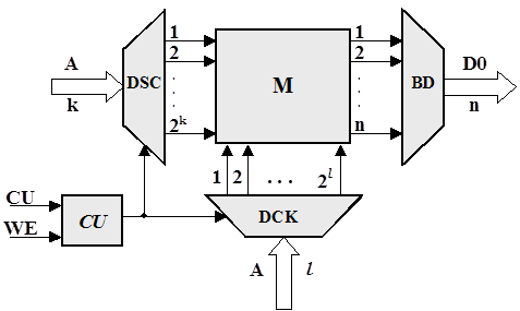Обобщенная структурная схема БИС ОЗУ с матричной организацией приведена на рисунке 14. Код адреса ячейки поступает на адресные дешифраторы, которые выбирают в накопителе нужную строку и столбец. Выборка ячейки происходит по принципу