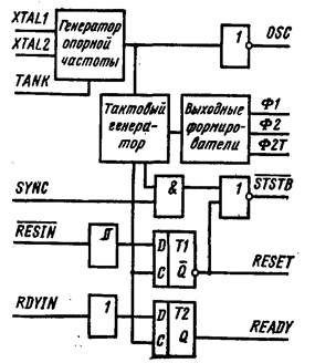 При поступлении входного сигнала RESIN микросхема КР580ГФ24 с помощью триггера Шмитта и триггера Т1 вырабатывает сигнал RESET, синхронизированный с тактовым сигналом Ф2, По сигналу RESET осуществляется установка в исходное состояние различных устройств микропроцессорной системы. Наличие в микросхеме триггера Шмитта позволяет подавать на вход RESIN сигнал с пологим фронтом. С помощью триггера Т2 осуществляется стробиро-вание входного сигнала RDYIN “Готовность” тактовым сигналом Ф2.