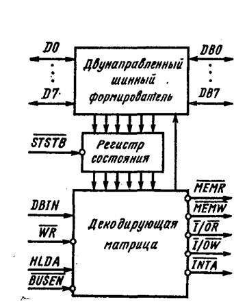 Декодирующая матрица в зависимости от режима работы микропроцессора, зафиксированного в регистре состояния, и входных управляющих сигналов HLDA, WR, DBIN формирует сигнал INTA “Подтверждение прерывания” или сигналы чтения/записи при обращении к ОЗУ или УВВ.