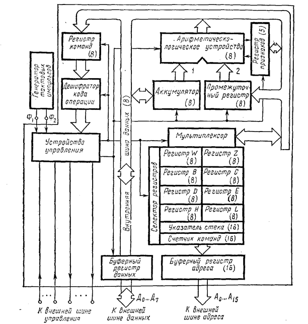 Рис. 1. Микропроцессор Intel 8080. В РФ были введены указатель стека, активно используемый при обработке прерываний, а также два программнонедоступных регистра для внутренних пересылок. Блок РОНов был реализован на микросхемах статической памяти. Исключение аккумулятора из РФ и введение его в состав АЛУ упростило схему управления внутренней шиной. Новое в архитектуре МП - использование многоуровневой системы прерываний по вектору. Такое техническое решение позволило довести общее число источников прерываний до 256 (до появления БИС контроллеров прерываний схема формирования векторов прерываний требовала применения до 10 дополнительных чипов средней интеграции). В i8080 появился механизм прямого доступа в память (ПДП) (как ранее в универсальных ЭВМ IBM System 360 и др.). ПДП открыл зеленую улицу для применения в микроЭВМ таких сложных устройств, как накопители на магнитных дисках и лентах дисплеи на ЭЛТ, которые и превратили микроЭВМ в полноценную вычислительную систему. Традицией компании, начиная с первого кристалла, стал выпуск не отдельного чипа ЦП, а семейства БИС, рассчитанных на совместное использование. Микропроцессор, иначе, центральный процессор - Central Processing Unit (CPU) - функционально законченное программно-управляемое устройство обработки информации, выполненное в виде одной или нескольких больших (БИС) или сверхбольших (СБИС) интегральных схем. Для МП на БИС или СБИС характерны:
