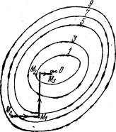 Проведем такую же минимизацию целевой функции по переменным x3, x4, . . . ,xn. Дойдя до переменной xn, снова вернемся к x1 и продолжим процесс. Эта процедура вполне оправдывает название метода. С ее помощью мы построим последовательность точек М0,М1,М2, . . . , которой соответствует монотонная последовательность значений функции f(M0)>= f(M1)>= f(M2) >= ... Обрывая ее на некотором шаге k можно приближенно принять значение функции f(Mk) за ее наименьшее значение в рассматриваемой области. Отметим , что данный метод сводит задачу поиска наименьшего значения функции нескольких переменных к многократному решению одномерных задач оптимизации. Если целевая функция f(x1, x2, ... ,xn) задана явной формулой и является дифференцируемой, то мы можем вычислить ее частные производные и использовать их для определения направления убывания функции по каждой переменной и поиска соответствующих одномерных минимумов. В противном случае, когда явной формулы для целевой функции нет, одномерные задачи следует решать с помощью одномерных методов На рис.изображены линии уровня некоторой функции двух переменных u= f (х, у). Вдоль этих линий функция сохраняет постоянные значения, равные 1, 3, 5, 7, 9. Показана траектория поиска ее наименьшего значения, которое достигается в точке О, с помощью метода покоординатного спуска. При этом нужно ясно понимать, что рисунок служит только для иллюстрации метода. Пусть требуется решить задачу (2): f(x) В двумерном пространстве R2. Решение