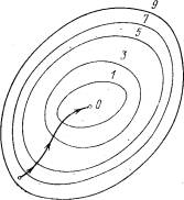 где gi – пробный шаг по i-й переменной, выбираемый достаточно малым для разностной оценки производной. Отметим, что при таких расчетах gi ,нельзя брать слишком малым, а значения функции нужно вычислять с достаточно высокой степенью точности, иначе при вычислении разности Df(x1, ...,xi+ gi, ..., xn) - f(x1, ..., xi, ..., xn) Df(x1, ...,xi+ gi, ..., xn) - f(x1, ..., xi- gi,..., xn) будет допущена большая ошибка. Первый алгоритм требует меньших затрат по сравнению со вторым (обычно затраты выражаются количеством вычислений критерия оптимальности), но позволяет получить решение менее точно, чем второй, эта погрешность зависит от величины пробного шага На рис. изображены линии уровня функции двух переменных u= f (х, у), , и приведена траектория поиска ее минимума с помощью метода градиентного спуска.