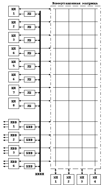 Коммутационная матрица выполняет передачу данных между процессорами и памятью, а также между процессорами ввода-вывода и памятью. Коммутируются только внутренние шины МПВК, основное назначение которых – высокоскоростная передача данных, для этих шин нет смысла добиваться высокой протяженности проводников или стандартизации с целью упрощения подключения дополнительных устройств. Высокоскоростной обмен с периферийными устройствами осуществляется посредством процессоров ввода-вывода, которые являются контроллерами периферийных высокоскоростных шин, к которым, в свою очередь и подключаются контроллеры соответствующих устройств. На роль таких периферийных шин подходят, например, VME (применяется в МПВК фирмы Digital Equipment Company), SBus (применяется в МПВК фирмы Sun Microsystems) или PCI (применяется в МПВК, построенных на процессорах фирмы Intel семейства x86). В SMP совместимой системе прерывания управляются контроллерами APIC (Advanced Programmable Interrupt Controller), БИС которых серийно выпускаются многими производителями микроэлектронных изделий (например DEC, Sun, IBM, Texas Instruments). Данные контроллеры обладают распределенной архитектурой, в которой функции управления прерываниями распределены между двумя функциональными блоками: локальным (ЛБ) и ввода-вывода (БВВ). Эти блоки обмениваются информацией через шину, называемую шиной коммуникаций контроллера прерываний (ШККП). Устройство ввода-вывода определяет появление прерывания, адресует его локальному блоку и посылает по шине ШККП. Блоки APIC совместно отвечают за доставку прерывания от источника прерываний до получателей по всей системе. Использование такой организации дополнительно увеличивает расширяемость за счет разгрузки разделения между процессорами нагрузки по обработке прерываний. Благодаря распределенной архитектуре, локальные блоки или блоки ввода-вывода могут быть реализованы в отдельной микросхеме или интегрированы с другими компонентами системы. В МПВК подобной структуры нет конфликтов из-за связей, остаются только конфликты из-за ресурсов. Возможность одновременной связи нескольких пар устройств позволяет добиваться очень высокой производительности комплекса. Важно отметить и такое обстоятельство, как возможность установления связи между устройствами на любое, даже длительное время, так как это совершенно не мешает работе других устройств, зато позволяет передавать любые массивы информации с высокой скоростью, что также способствует повышению производительности комплекса. Кроме того, к достоинствам структуры с перекрестной коммутацией можно отнести простоту и унифицированность интерфейсов всех устройств, а также возможность разрешения всех конфликтов в коммутационной матрице. Важно отметить и то, что нарушение какой-то связи приводит не к выходу из строя всего устройств, т.е. надежность таких комплексов достаточно высока. Однако и организация МПВК с перекрестной коммутацией не свободна от недостатков. Прежде всего - сложность наращивания ВК. Если в коммутационной матрице заранее не предусмотреть большого числа входов, то введение дополнительных устройств в комплекс потребует установки новой коммутационной матрицы. Существенным недостатком является и то, что коммутационная матрица при большом числе устройств в комплексе становится сложной, громоздкой и достаточно до