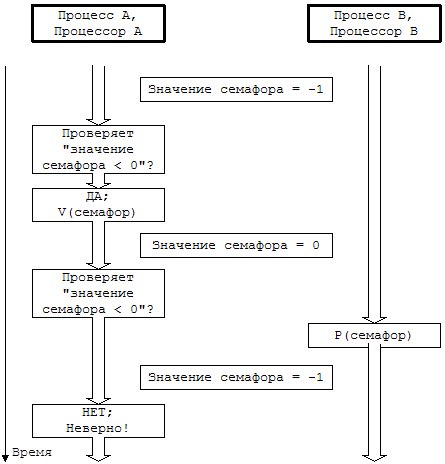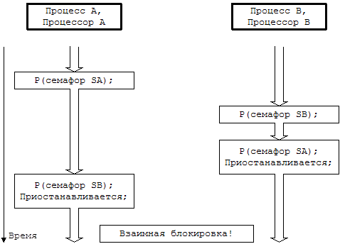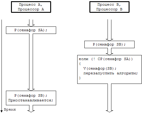 последовало бы возникновение тупиковой ситуации; процесс A на одноименном процессоре захватывает семафор SA, в то время как процесс B на своем процессоре захватывает семафор SB. Процесс A пытается захватить и семафор SB, но в результате операции P переходит в состояние приостанова, поскольку значение семафора SB не превышает 0. То же самое происходит с процессом B, когда последний пытается захватить семафор SA. Ни тот, ни другой процессы продолжаться уже не могут. Для предотвращения возникновения подобных ситуаций используются соответствующие алгоритмы обнаружения опасности взаимной блокировки, устанавливающие наличие опасной ситуации и ликвидирующие ее. Тем не менее, использование таких алгоритмов "утяжеляет" ядро. Поскольку число ситуаций, в которых процесс должен одновременно захватывать несколько семафоров, довольно ограничено, легче было бы реализовать алгоритмы, предупреждающие возникновение тупиковых ситуаций еще до того, как они будут иметь место. Если, к примеру, какой-то набор семафоров всегда блокируется в одном и том же порядке, тупиковая ситуация никогда не возникнет. Но в том случае, когда захвата семафоров в обратном порядке избежать не удается, операция CP предотвратит возникновение тупиковой ситуации: