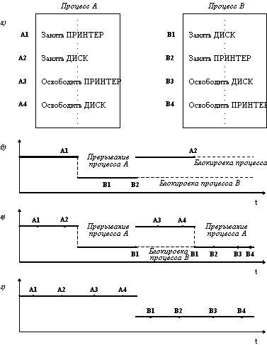 В момент возникновения прерывания значение семафора не превышает 0, поэтому результатом выполнения операции CP всегда будет "ложь". Проблема решается путем запрещения всех прерываний на то время, пока семафор захвачен процессом. 3.4 Тупиковые ситуации Рассмотрим пример тупика. Пусть двум процессам, выполняющимся в режиме мультипрограммирования, для выполнения их работы нужно два ресурса, например, принтер и диск. На рисунке показаны фрагменты соответствующих программ.