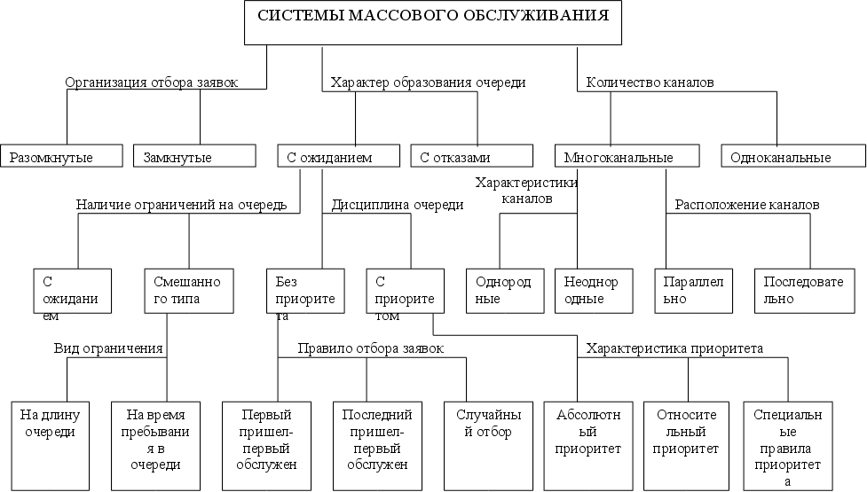 Рис.1 Классификация систем массового обслуживания1.4. Характеристики СМО. Перечень характеристик систем массового обслуживания можно представить следующим образом: