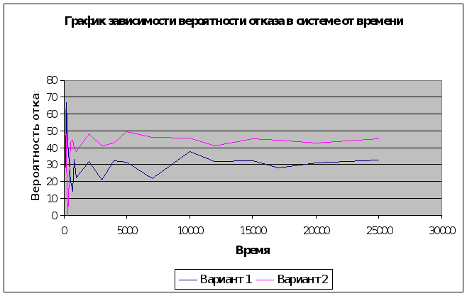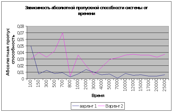 графики зависимостей: - количества обслуженных и поступивших заявок от времени. Графики представлены в приложениях 2-4. 5. Выводы. В результате моделирования работы СМО, а также анализ полученных данных и были сделаны следующие выводы: 1. При времени функционирования системы меньше 2000, работа системы нестабильна, трудно выявить какие-либо закономерности в поведении системы. Поэтому, чтобы сделать выводы об эффективности работы СМО, следует рассматривать её функционирование на временном интервале более 2000 единиц. 2. При увеличении времени функционирования системы соответственно увеличивается и количество заявок, поступивших в систему. Количество поступивших и обслуженных заявок увеличивается пропорционально увеличению времени работы системы. Причем, чем больше значения интенсивностей, тем больше быстрее увеличивается количество поступающих заявок с увеличением времени. 3. На интервале времени до 3000 значение абсолютной пропускной способности системы хаотически колебалось (особенно это заметно при втором варианте реализации). При времени больше 3000 амплитуда колебаний снизилась, а при времени Т7000 значения абсолютной пропускной способности системы для обоих вариантов приобретают стационарный характер, и примерно равны 0,004 для первого варианта работы системы и 0,036- для второго. 4. Значение относительной пропускной способности системы хаотически колебалось при всех временах функционирования. Однако, при больших временах амплитуда колебаний значительно снизилась. С увеличением времени заметна тенденция к стационарности в поведении величины относительной пропускной способности. 5. Т. к. вероятность отказа системы величена обратная относительной пропускной способности системы, то их поведение аналогично. При малых значениях времени (до 7000) вероятность отказа хаотично колебалась. А при увеличении времени, амплитуда колебания значительно снизилась. Практически вероятность отказа принимает стационарный характер при значении времени больше 17000. Заключение. Целью данного курсового проекта было построение модели двухканальной СМО с отказами и абсолютным приритетом. Модель СМО была и реализована с помощью программы в среде TURBO PASKAL. В процессе нескольких реализаций работы СМО для двух вариантов значений интенсивностей поступления заявок в были получены результаты функционирования системы. На основе полученных данных были построены графики, позволяющие провести исследование работы СМО. С помощью графиков проведен анализ полученных данных и сделаны выводы о работе систстемы. Проведенное исследование наиболее наглядно отображают графики, приведенные в приложениях 2-4. Приложение 1. Результаты работы СМО.