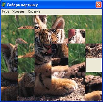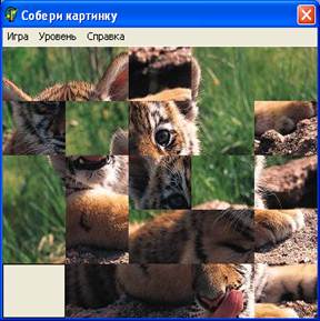 5. Создать процедуру для пункта меню игра – новая: procedure TForm1.N2Click(Sender: TObject) (стр.22 ) Эта процедура позволяет игроку начать игру сначала. Картинка снова разрезается на фрагменты, которые перемешиваются и отображаются на форме. 6. Для пункта набор картинок нужно сделать следующее: заполнить компонент OpenPictureDialog файлами с изображениями формата bmp, затем создать процедуру (щелчок мышью по набор картинок) procedure TForm1.N3Click(Sender: TObject) (стр.22 ), которая даст возможность выбирать эти изображения во время игры. Таким образом, программа будет работать для картинки, загружаемой во время старта программы, а также позволит загружать произвольные изображения формата bmp. 7. Программируем пункт меню выход: procedure TForm1.N11Click(Sender: TObject) (стр.21 ) Эта процедура обеспечивает выход из игры. 8. Чтобы была возможность выбора уровня игры, необходимо создать следующие процедуры: для пункта простой - procedure TForm1.N8Click(Sender: TObject) (стр.22 ); для пункта средний - procedure TForm1.N9Click(Sender: TObject) (стр.22 ); для пункта сложный - procedure TForm1.N10Click(Sender: TObject) (стр.23). Уровни зависят от количества фрагментов, на которые разбивается картинка.