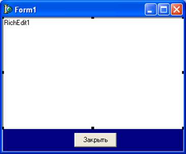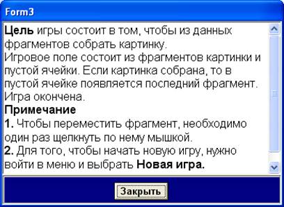Сложный уровень 9. Чтобы игрок мог ознакомиться с правилами игры, выбрав в меню пункт правила игры, необходимо сделать следующее: · В программе Word Pad набрать текст, содержанием которого являются правила игры „ Собери картинку ”, сохранить его в файле формата rtf под названием „Правила”. Полученный файл сохранить в папке, где находится проект Soberi. · Создать новую форму Form3; · Разместить на форме объекты: Button1 и Panel1 из страницы Standart и RichEdit1 из Win32; · Изменить некоторые свойства объектов: Для Panel1: Align – alBottom. Для Button1: Caption – Закрыть. Для RichEdit1: Align – alClient; ScrollBars – Vertical; Форма будет иметь вид: