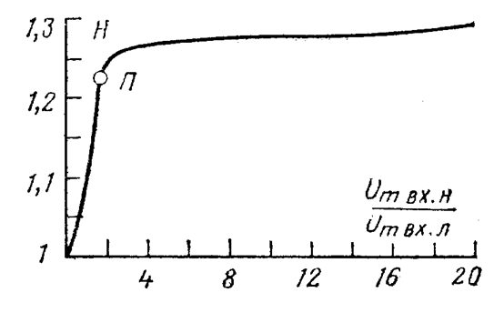 Сопротивление в цепи базы находится по формуле: Нагрузочная характеристика для переменного тока проходит через точку А (рисунок 2.1.2) и имеет угол наклона, равный arctg α2= gэ1/p2к arctg α2=15,6*10-6 /0,01=0,0156 Этому углу соответствует линия 2 на рисунке 2.1.2. Для точки Б получаем Iкмакс=16 мА, Iбмакс=0,35 мА.Максимальная амплитуда входного сигнала, с которой начинается ограничение, равна: Uмвх.л=0,5(Uбб-Uбв)=0,5(0,9-0,4)=0,25 В. Rб=(6-0,8)/((16-2,2)*10-3)*25=10 кОм Амплитуда напряжения на коллекторном контуре определяется по формуле: Umвых.л=ркY21 Uмax.вх /gэ1 Umвых.л=0,1*0,033*0,25/15,6*10-6=5,3 В Когда амплитуда входного сигнала превышает Uмax.вх, транзистор работает с отсечкой обоих полупериодов, и выходной сигнал соответствует уравнению Umвых.н=Umвых.л Н(Umвх.н/Umвх.л) где Umвых.н – амплитуда напряжения на выходе ограничителя, В при входной амплитуде Umвх.н, В; Umвых.л – максимальная амплитуда напряжения на входе, В, при работе в линейном участке; Н(Umвх.н/Umвх.л) – коэффициент, определяемый по рисунку 2.1.3. Он представляет собой часть амплитудной характеристики ограничителя, работающего в нелинейном режиме. Пороговое напряжение ограничителя, при котором он еще работает в линейном режиме, определяется по формуле: Uпор=1,5Umвх.л=1,5*0,25=0,375 В При отношении Umвх.н/Umвх.л равном двум, находим по рисунку 2.1.3 величину Н. Н=1,25. Следовательно, напряжение на выходе ограничителя составит Umвых.н=Umвых.л Н(Umвх.н/Umвх.л)=5,3*1,25=6,62 В Проведя ряд аналогичных вычислений для разных значений входного напряжения, заносим результаты в таблицу 2.1.1. Таблица 2.1.1
