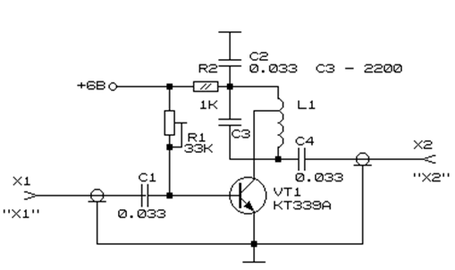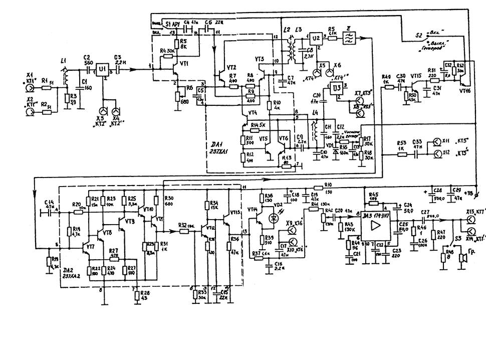 Рисунок 1.1.2 - Принципиальная схема согласующего модуля обеспечивается транзисторами VT1 и VT2 в соответствующем включении (составной истоково-эмиттерный повторитель). Напряжение на выходах 2 и 3 модуля практически равно напряжению на входе 1. Таким образом, вольтметр, подключенный к выходу 2 модуля , измеряет напряжение на выходе исследуемого узла. При этом емкость вольтметра не вызывает смещения резонансной частоты контура. В то же время сигнал с выхода 3 модуля поступает на вход следующего каскада приемника. Модуль также может быть использован для подачи сигнала на вход следующего каскада от генератора, подключаемого к выводу 2 модуля. Макет имеет следующие органы регулировки, индикации и коммутации (см. схему в Приложении 1): - регулятор частоты гетеродина (потенциометр R17), осуществляющий перестройку гетеродина по частоте; - регулятор громкости (R42); - выключатель системы АРУ (S1); - выключатель напряжения питания гетеродина и преобразователя частоты (S2). Этот выключатель конструктивно совмещен с потенциометром R17 («Частота гетер.»). Гетеродин выключается при повороте потенциометра против часовой стрелки до упора; - переключатель нагрузки (S3) с громкоговорителя на эквивалент нагрузки (R48); - выключатель питающего напряжения (на принципиальной схеме не показан); - индикатор включения электропитания (тоже не показан); - индикатор настойки приемника (VD2). 1.2 Принципиальная схема Входной сигнал через гнездо X1 или X2 (Приложение 1) поступает на входной неперестраиваемый контур L1C1, настроенный на середину рабочего диапазона приемника (около 1,1 МГц). Резистор R3 служит для снижения добротности входного контура, следовательно, для расширения полосы пропускания. Далее сигнал через разделительный конденсатор C2 поступает на вход унифицированного контрольного модуля U1, служащего для согласования входной цепи с измерительными приборами, подключаемыми к гнездам Х3, Х4. Далее сигнал через разделительный конденсатор С3 подается на вывод 1 микросхемы К237ХА1. Микросхема DA1 выполняет функции усилителя радиочастоты и преобразователя частоты. С выхода усилителя радиочастоты (VT1) через конденсатор С6 сигнал подается на вход балансного смесителя (вывод 11 микросхемы DA1, VT2, VT3). Смеситель нагружен на колебательный контур L2L3C8. Для обеспечения требуемой полосы пропускания в схеме применяется фильтр Z1. Гетеродинная часть микросхемы (VT4, VT5, VT6) работает совместно с балансным смесителем. Частота гетеродина задается колебательным контуром L4C11C12 и емкостью варикапа VD1. Частотой гетеродина можно управлять с помощью резистора R17, изменяющего обратное напряжение на варикапе, а следовательно, его емкость. Частота гетеродина через унифицированный контрольный модуль U3 подается на гнезда Х7, Х8 для последующего наблюдения и контроля. Сигнал промежуточной частоты с фильтра Z1, имеющего полосу пропускания около 6 кГц, поступает на вывод 1 микросхемы DA2 (К237ХА2). На данной микросхеме выполнен усилитель промежуточной частоты (VT7-VT11), детектор (VT12) и предварительный усилитель звуковой частоты (VT13). В усилителе предусмотрена система автоматической регулировки усиления, управляющее напряжение с которой снимается с вывода 10 микросхемы DA2 и подается на вывод 13 микросхемы DA1, а также через дифференцирующую цепочку R53C33 на гнёзда Х11, Х12 для последующего контроля и наблюдения. Продетектир