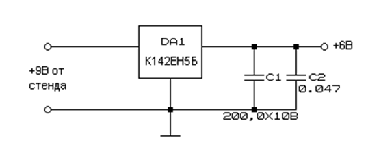 Основные функциональные узлы приемника: ВЦ – входная цепь; УРЧ – широкополосный усилитель радиочастотного сигнала; ПрЧ – преобразователь частоты; Г – перестраиваемый гетеродин; ПФ – полосовой фильтр промежуточной частоты с полосой пропускания около 5-6 кГц; УПЧ – усилитель промежуточной частоты; Д – детектор; УЗЧ – усилитель колебаний звуковых частот; ДАРУ – детектор системы автоматической регулировки усиления; ФНЧ – фильтр нижних частот системы АРУ; Гр – громкоговоритель; Rн – эквивалент сопротивления нагрузки. Большая часть функциональных узлов приемника реализована на трех интегральных микросхемах . Усилитель радиочастотного сигнала, преобразователь частоты и перестраиваемый гетеродин собраны на микросхеме К237ХА1. Гетеродин можно перестраивать по частоте при помощи резистора R17 («Частота гетер») путем изменения обратного напряжения, подводимого к варикапу. Усилитель промежуточной частоты и детектор собраны на микросхеме К237ХА2. В усилителе колебаний звуковых частот применяется ИС К174УН7 в типовом включении. Принципиальная схема лабораторного стенда (без блока питания) приведена на Приложении 1. Для проведения экспериментов в лабораторном макете предусмотрены контрольные точки (КТ1-КТ7), к которым можно подключать измерительную аппаратуру через соответствующие коаксиальные разъемы на верхней панели макета. Во избежание нарушения нормальной работы приемника при подключении измерительной аппаратуры некоторые контрольные точки выведены через унифицированные контрольные модули (U1-U3 в Приложении 1) с коэффициентом передачи, равным примерно единице. Принципиальная схема согласующего модуля приведена на рисунке 1.1.2. Модуль обладает высоким значением входного сопротивления (около 100 кОм), и не ухудшает избирательных свойств колебательных систем входной цепи, гетеродина и преобразователя частоты. Высокое входное сопротивление модуля