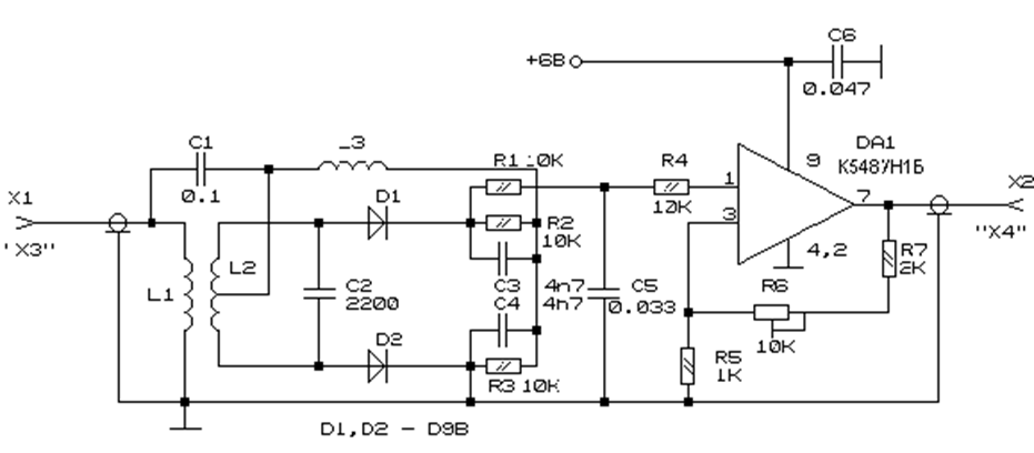 Qэ=4,65*105*0,5/(2*5*104)=2,32 4) Величина конструктивного коэффициента связи равна: kсв= β/Qэ=1/2,32=0,1 5) Выбираем диоды КД522, их крутизна Sд=5мА/В и емкость Сд=1,0 пФ. 6) Принимаем сопротивления нагрузки R2=R3=10 кОм, емкость монтажа См=5 пФ и собственная добротность контуров Qк=150. 7) Величины емкостей нагрузки диодов (в пикофарадах) равны; C3=C4=(4…5)*105/(FмаксR2) где Fмакс – максимальная частота модуляции в килогерцах; R1 – сопротивление нагрузки в килоомах. C3=C4=4,5*105/(10*10)=4500 пФ Выбираем стандартное значение 4,7 нФ, условие C3=C4≥Сд*10-См=10-5=5 пФ при этом соблюдается.