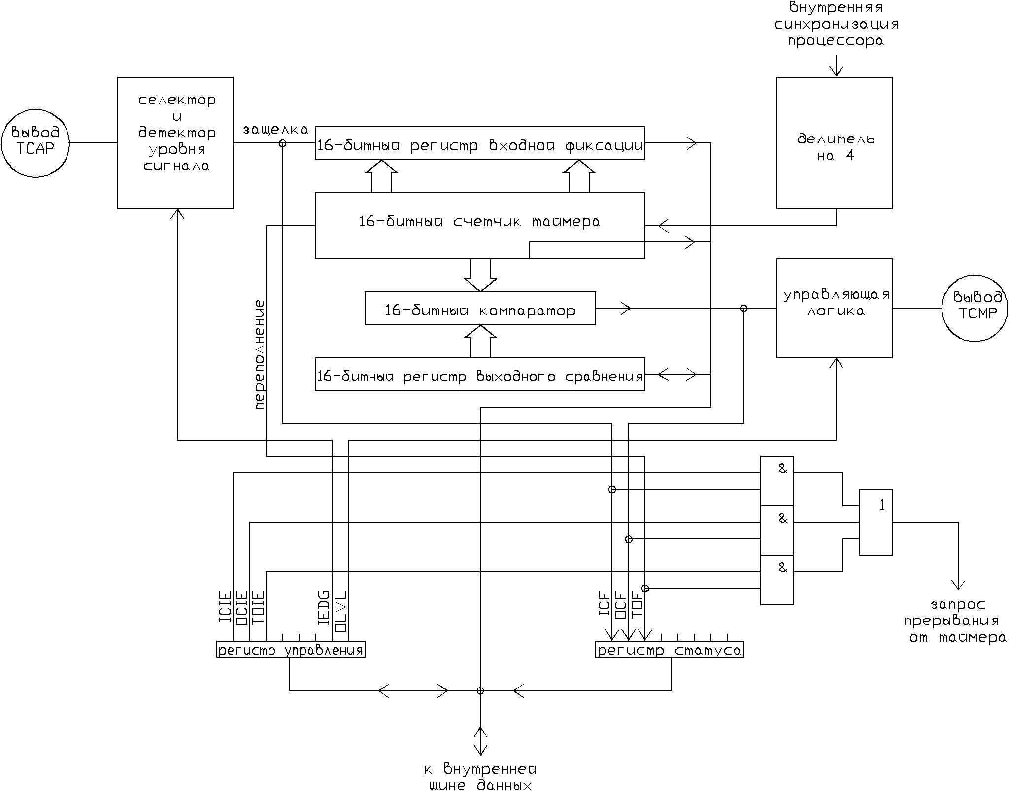Рис. 2-8 Блок-схема таймера. При начальной установке 16-битный счетчик таймера, расположенный по адресу 18Н-19Н, начинает работу со значения FFFCН. Далее значение счетчика увеличивается на единицу при поступлении синхроимпульса с предделителя частоты, дающего разрешение в 2 мкс при использовании кварца 4МГц. Когда значение счетчика достигает FFFFH, он сбрасывается в 0000H, устанавливая флаг переполнения. Значение счетчика дублируется в альтернативном счетчике, расположенном по адресу 1АН-1ВН. Единственное различие этих регистров состоит в том, что при чтении счетчика происходит сброс флага переполнения, а при обращении к альтернативному счетчику этого не происходит. Счетчик, как и альтернативный счетчик, может быть прочитан в любой момент, но не может быть записан. Если сначала читается старший байт счетчика (18Н), то младший байт запоминается в буфере. Это значение остается в буфере неизменным даже если старший байт читается несколько раз. Доступ к буферу осуществляется при чтении младшего байта счетчика. Если же считывать несколько раз только содержимое младшего байта счетчика, то каждый раз при этом будут считываться разные значения, соответствующие моменту считывания. Регистр входной фиксации (Input Capture Register) расположен по адресу 14Н-15Н и предназначен только для чтения из него времени обнаружения на выводе TCAD сигнала. Уровень сигнала, вызывающего фиксацию времени, задается программно через бит IEDG управляющего регистра. RESET не оказывает влияния на содержимое регистра входной фиксации. Значение в регистре ICR при фиксации будет на единицу больше значения счетчика в момент фиксации. Эта задержка необходима для внутренней синхронизации. Таким образом, счетчик и регистр входной фиксации имеют одинаковое разрешение, равное четырем циклам внутренней синхронизации. При обнаружении сигнала на выводе ТСАP содержимое счетчика фиксируется в ICR вне зависимости от состояния флага ICF (см. регистр статуса). Поэтому ICR всегда содержит время последней фиксации. При чтении старшего байта регистра входной фиксации (14Н) фиксация следующего значения запрещается до тех пор, пока не будет прочитан младший байт. Чтение же младшего байта не влияет на возможность очередной входной фиксации. Регистр выходного сравнения (Output Compare Register) расположен по адресу 16Н-17Н и используется для программирования какого-либо действия в определенное время (т. е. когда счетчик достигнет определенного значения). Все биты регистра могут быть прочитаны и записаны в любой момент времени, и не изменяют свое состояние при RESET. Если в функции выходного сравнения нет необходимости, эти ячейки памяти могут использоваться для других целей. Значение в регистре выходного сравнения сравнивается со счетчиком каждые 4 цикла. Когда значения совпадают, устанавливается флаг (OCF) и уровень бита OLVL (см. регистр статуса таймера) передается на вывод ТСМР. Так же может происходить прерывание, если установлен бит OCIE. Содержимое регистра выходного сравнения и бит OLVL должны изменяться после каждого удачного сравнения, для того чтобы начать новый цикл сравнения. При записи сначала в старший байт ОСR (16Н) сравнение не будет производиться до тех пор, пока не будет записан младший байт. При записи же сначала в младший байт, функция сравнения будет активирована. Таким образом, пользователь должен записать о