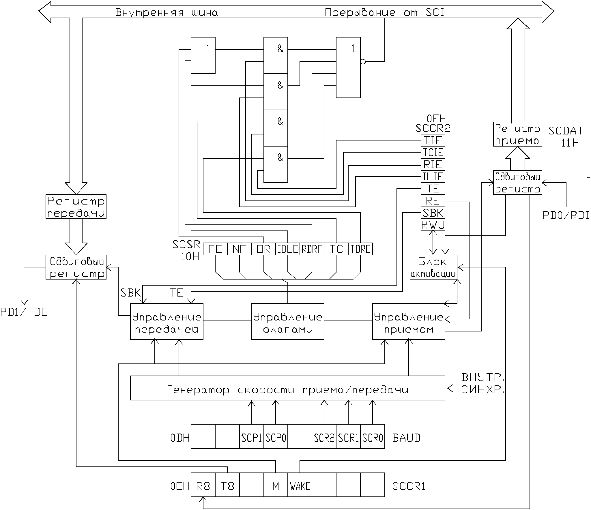 TIE-бит разрешения/запрета прерываний передатчика, при TIE=1-прерывания разрешены, при TIE=0-прерывания запрещены. TCIE-бит разрешения/запрета прерываний при завершении передачи, при TCIE=1-прерывания разрешены, при TCIE=0-прерывания запрещены. RIE-бит разрешения/запрета прерываний от приемника, при RIE=1-прерывания разрешены, при RIE=0-прерывания запрещены. ILIE-бит разрешения/запрета прерывания при освобождении линии , при ILIE=1-прерывание разрешено, при ILIE=0-прерывание запрещено. TE-бит разрешения/запрета передачи, при TE=1-выход передающего сдвигового регистра подключен к линии TD0. В зависимости от бита M передаются 10 (M=0) или 11 (M=1) бит. при TE=0-передача запрещается после завершения передачи байта, который обрабатывался в момент сброса бита TE, линия TD0 переходит в высокоимпедансное состояние, RE-бит запрета/разрешения приема, при RE=1-линия RDI соединяется со сдвиговым регистром приемника, при RE=0-прием запрещен. RWU-метод активизации приемника, при RWU=1-приемник в режиме ожидания, при RWU=0-если бит WAKE=1, то бит RWU сбрасывается после приема слова данных. Если WAKE=0, бит RWU сбрасывается после приема 10 (M=0), либо 11 (M=1) бит. SBK-посылка сигнала останов, при SBK=1-передатчик посылает блоки нулей (серии из 10 или 11) до очистки сдвигового регистра. Затем передатчик посылает один бит высокого уровня для определения старт-бита. при SBK=0-передатчик посылает 10 или 11 нулей и затем возвращается в свободное состояние или продолжает посылки информации. Если сдвиговый регистр передатчика пуст и линия свободна, установка и очистка SBK может поставить в очередь до двух посылок сигнала останова, т.к. первый сигнал передается немедленно в сдвиговый регистр, а второй встает в очередь в параллельный буфер передатчика. Регистр статуса (SCSR) находится по адресу 10Н и содержит два флага статуса передатчика, и 5 флагов, относящихся к приемнику. Регистр статуса