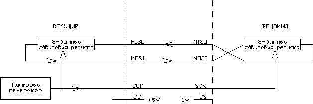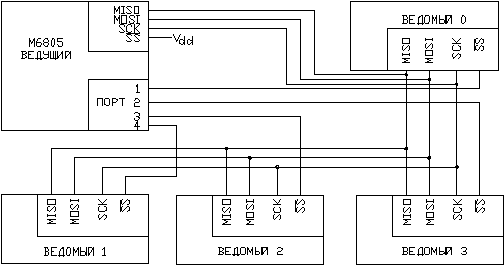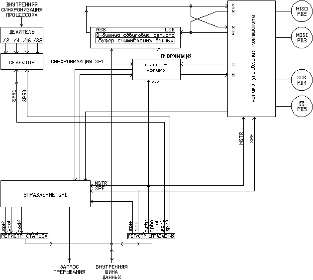 Рис. 2-12. Структурная схема SPI. На рис. 2-13 представлена типовая схема подключения пяти микропроцессорных устройств, из которых одно является ведущим, а четыре-ведомыми. В этой системе у каждого устройства обозначены основные контакты: MISO, MOSI, SCK и SS\.