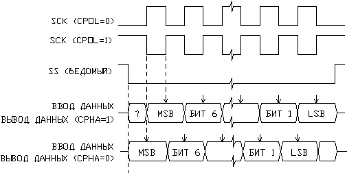 SPIE-бит разрешения/запрета прерываний от последовательного интерфейса связи, при SPIE=1 прерывания разрешены, при SPIE=0 прерывания запрещены, SPE-активация/блокировка интерфейса, при SPE=1-система периферийного интерфейса активирована, при SPE=0-система блокирована, MSTR-бит выбора режима ведущий/ведомый, при MSTR=1-режим "ведущий", при MSTR=0-режим "ведомый", CPOL-бит полярности синхронизации (см. рис. 17), при CPOL=1-SCK-линия считается нерабочей в высоком состоянии, при CPOL=0-SCK-линия считается нерабочей в низком состоянии, CPHA-фаза синхронизации (см. рис. 17), при CPHA=1 вывод SS\ является управляющим выводом доступа к данным при CPHA=0-сдвиг синхронизации является логическим "ИЛИ" SCK и SS. Когда SS в состоянии 0 первый фронт SCK является сигналом начала передачи. Биты SPR0,SPR1 задают скорость передачи данных, которую можно выбрать, руководствуясь таблицей:
