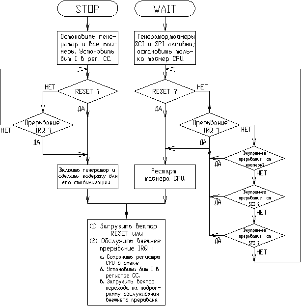 RESET по отсутствию сигнала синхронизации происходит при условии, что бит CME в регистре COPCR установлен. В этом случае диспетчер синхронизации контролирует наличие/отсутствие сигнала синхронизации в течение определенного промежутка времени. Этот период колеблется от 5 до 100 мс и зависит от параметров работы процессора. Например, при рабочей частоте синхронизации 200 КГц и менее, диспетчер синхронизации использоваться не может. Если определено отсутствие синхронизации, либо ее низкая частота, то происходит сброс, сигнал которого поступает на внешние устройства через двунаправленный вывод RESET/ в течение четырех циклов. 3.2 Режимы с пониженным энергопотреблением.ОЭВМ предусматривает 3 режима с пониженным энергопотреблением, которые могут использоваться в схемах, питающихся от батарей и в автомобильной технике. Команды STOP и WAIT оказывают влияние на системы SPI, SCI и таймера. Режим STOP. В этом режиме ОЭВМ потребляет минимально возможную энергию, поскольку внутренний тактовый генератор выключен, вызывая тем самым прекращение всех внутренних процессов. В режиме останова бит I сбрасывается, разрешая все внешние прерывания. Все остальные регистры и память остаются без изменения. Без изменения остаются и линии ввода-вывода. Это состояние сохраняется до тех пор, пока не появиться сигнал IRQ либо RESET. В этот момент внутренний генератор возобновит работу. Вход в режим осуществляется программно командой STOP. Последовательный интерфейс связи в этот момент прекращает работу. Если в этот момент происходила передача информации, то она прекращается, и возобновляется при подаче сигнала низкого уровня на вывод IRQ\ микросхемы. Если же интерфейс принимал информацию, то данные теряются. Поэтому передатчик должен находиться в состоянии ожидания в ходе режима STOP. Последовательный периферийный интерфейс в ходе режима STOP продолжает прием и передачу информации если он был конфигурирован как ведомый. Единственное отличие состоит в том, что ни один флаг не будет установлен либо сброшен до тех пор, пока сигнал IRQ\ не поступит на внешний вывод. Однако при работе в режиме STOP необходимо соблюдать осторожность, поскольку схема защиты (биты WCOL, MODF и др.) не работает. Если же интерфейс был конфигурирован как ведущий, то его работа прекращается и может быть продолжена только после сигнала IRQ\. Таймер в ходе режима STOP сохраняет в счетчике последнее значение. Если же на выводе ТСАР появляется сигнал, то схема входной фиксации срабатывает, и после окончания режима STOP устанавливается соответствующий флаг (во время режима никаких действий не производится). Команда WAIT также помещает микропроцессор в режим с пониженным потреблением энергии (режим WAIT), но с несколько большим потреблением, чем при STOP-режиме. При режиме WAIT все процессы в блоке центрального процессора остановлены, но внутренний генератор, таймер и интерфейсы (связи и периферийный) в том случае, если они активизированы, работают. Прерывание от любого из этих устройств вызовет выход из режима. В ходе режима WAIT бит I сброшен, допуская внешние прерывания. Все остальные регистры-память и линии ввода-вывода остаются без изменения. то состояние сохраняется до тех пор, пока не возникнет прерывание либо RESET. Последним из режимов с пониженным энергопотреблением является режим сохранения данных. Содержимое ОЗУ и регистров 
