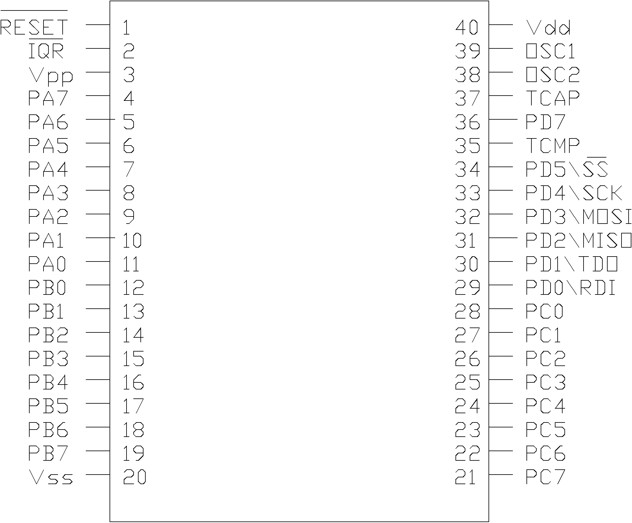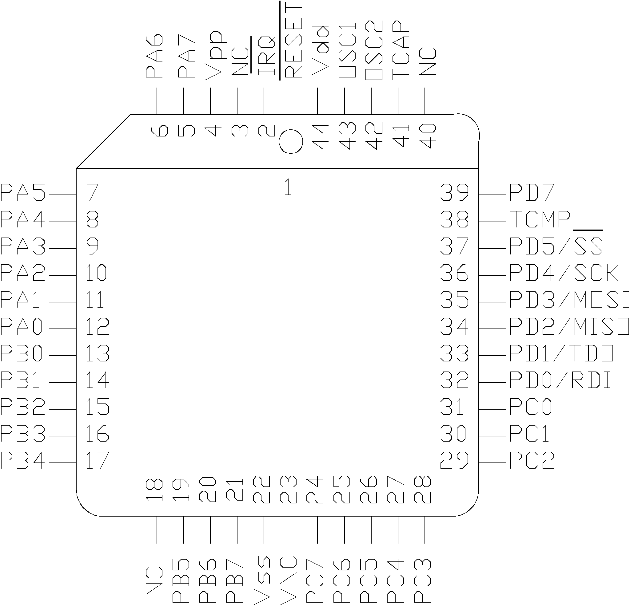 Рис.п1б. Цоколевка и наименование выводов для PLCC корпуса. Рассмотрим подробнее назначение выводов ОЭВМ. Выводы Vdd и Vss используются для подключения источника питания. На Vdd подается напряжение питания +5В, а вывод Vss соединяется с общей шиной. Вывод Vpp используется при программировании ПЗУ или ППЗУ. Напряжение программирования (+14.75В) подается на этот вывод, когда программируется ППЗУ. В других случаях на этот вывод подается напряжение питания. ПРЕДУПРЕЖДЕНИЕ: не допускается соединять Vpp c Vss. Это приведет к повреждению ОЭВМ. Вход внешнего запроса на прерывание IRQ функционирует в одном из двух режимов. В первом режиме входная логика срабатывает по отрицательному фронту, во втором-по отрицательному фронту и низкому уровню . Во втором случае как отрицательный, так и низкий уровень, подаваемый на IRQ, будут приводить к прерыванию. При возникновении на входе IRQ отрицательного фронта, возникает запрос прерывания. Когда ОЭВМ заканчивает выполнение текущей команды, проверяется наличие запроса прерывания. Если запрос обнаружен и бит маски прерывания (1-ый бит в регистре флагов) сброшен в ноль, то ОЭВМ переходит на процедуру обработки прерывания. Если выбран режим срабатывания входа IRQ по уровню, то этот вывод необходимо соединить через резистор с напряжением питания +5В для обеспечения возможности операции "монтажное или". Вывод RESET является двунаправленным, с низким активным уровнем. При подаче на вывод RESET логического нуля, происходит инициализация ОЭВМ. В случае сбоя, определяемого системами СОР-таймера или диспетчера частоты синхронизации, на выходе RESET устанавливается логический ноль для инициализации внешних устройств, подключенных к ОЭВМ. Выводы OSC1 и OSC2 используются для подачи тактовой частоты для ОЭВМ. Тактовые сигналы могут формироваться с помощью кварцевого резонатора, или подаваться от внешнего генератора импульсов. Внутренняя тактовая частота получается делением частоты генератора на 2. Схема, показанная на рисунке п2а, рекомендуется в случае использования кварцевого резонатора. Внутренний генератор разработан для работы с кварцевым резонатором или керамическим резонатором с частотой 4MHz. Кварцевый резонатор и дополнительные элементы этой схемы должны быть установлены как можно ближе к соответствующим выводам ОЭВМ для того, чтобы минимизировать искажения сигнала и время запуска генератора. Схема на рисунке п2б рекомендуется, когда используется внешний генератор тактовых импульсов. Тактовые импульсы подаются на вход OSC1, а вывод OSC2 остается незадействованным.
