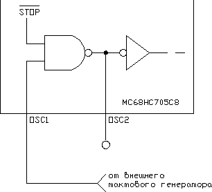 Рис.20б Схема подключения внешнего генератора. Порт A использует выводы РА0-РА7 . Каждый вывод порта А может быть запрограммирован на ввод или вывод информации. Порт B использует выводы РВ0-РВ7. Каждый из выводов порта В может быть запрограммирован на ввод или вывод информации. Порт C использует выводы РС0-РС7. Каждый из выводов порта С может быть запрограммирован на ввод или вывод информации. Порт D использует выводы РD0-PD5, PD7. После включения или перезапуска все выводы порта конфигурируются как входы. Когда используется SPI (последовательный периферийный интерфейс) четыре вывода MISO/PD2, MOSI/PD3, SCK/PD4 и SS/PD5 используются SPI-системой. Когда осуществляется обмен данными по каналу SCI, вывод PD0/RDI используется для приема данных, передача данных осуществляется через SCI, вывод PD1/TDO используется для передачи данных. Приложение 2. Типовая схема подключения МС68НС705С8.На рисунке п3 показана схема включения ОЭВМ, которая может использоваться как базовая для любых применений MC68HC705C8. Способы построения тактового генератора и подключения ОЭВМ к источнику питания, примененные в этой схеме, рекомендуются при разработке устройств на основе микроЭВМ семейства MC68HC05. Обратите внимание, что неиспользованные входы подключаются через резисторы к источнику питающего напряжения +5В.