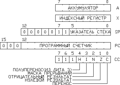 Реферат: Motorola MC68HC705C8Реферат: Motorola MC68HC705C8Однокристальная микроЭВММС68НС705С8ВведениеОднокристальная микроЭВМ (далее ОЭВМ) МС68НС705С8 входит в серию М68НС05 относительно дешевых ОЭВМ, использующих КМОП-технологию, сочетающую малые размеры и высокое быстродействие с низким потреблением энергии и высокой устойчивостью к помехам. Дополнительным преимуществом КМОП-структуры является то, что компоновка схемы полностью статична, т.е. ОЭВМ может работать при любой частоте синхронизации, меньшей, чем гарантированный максимум. Эта особенность может использоваться в целях экономии энергии, так как ее потребление возрастает с увеличением частоты синхронизации. Кроме того, для снижения потребления энергии используются еще два программно-управляемых режима работы с экономией энергии: Ожидание (WAIT) и Останов (STOP). Благодаря этим режимам ОЭВМ MC68HC705C8 находит особо широкое применение в автомобильной технике, а также в аппаратуре, питающейся от батарей. Индекс "705С8" в названии говорит о принадлежности данной ОЭВМ к серии С, в которую входят микросхемы общего назначения с наиболее гибкими параметрами. Цифра 8 в названии говорит о том, что это наиболее быстродействующая версия, допускающая частоту внешней синхронизации 8 МГц. Цифры 705 говорят об отличии от базовой модели МС68НС05С8 в конфигурации памяти, состоящее в том, что в базовой модели предусмотрено 8К ПЗУ, а в ее модификации МС68НС705С8 ПЗУ заменено на ППЗУ с ультрафиолетовым стиранием либо однократно программируемым ППЗУ. Кроме упомянутых ОЭВМ, серия М68НС05 включает в себя ОЭВМ с драйверами жидкокристалических, вакуумных и других дисплеев, ЦАП и АЦП, таймерами, ОЭВМ с различными конфигурациями памяти, быстродействием и другими отличительными особенностями. СОДЕРЖАНИЕСтраница Однокристальная микроЭВМ 1 МС68НС705С8 1 Введение 2 СОДЕРЖАНИЕ 3 1. Программная модель ОЭВМ МС68НС705С8. 4 1.1 Внутренняя структура. 4 1.2 Память. 6 1.3 Регистры. 7 1.4. Режимы адресации. 11 1.5. Набор команд. 18 2. Аппаратные средства 33 2.1 Линии (порты) параллельного ввода-вывода. 33 2.2 Система прерываний. 34 2.3 Таймер и связанные с ним устройства. 38 2.4 Последовательный интерфейс 42 3. Специальные режимы работы. 54 3.1 RESET. 54 3.2 Режимы с пониженным энергопотреблением. 56 Приложение 1. Расположение и назначение выводов МС68НС705С8. 59 Приложение 2. Типовая схема подключения МС68НС705С8. 62 1. Программная модель ОЭВМ МС68НС705С8.1.1 Внутренняя структура.ОЭВМ имеет ряд отличительных особенностей в аппаратном и программном обеспечении, которые перечислены ниже: Особенности аппаратного обеспечения: · КМОП-структура с высокой плотностью компоновки; · 8-разрядная архитектура; · режимы малого потребления энергии (Ожидание, Останов, и режим сохранения данных); · 24 двунаправленные линии ввода-вывода. · 7 однонаправленных линий (только ввод). · 2 линии ввода-вывода таймера. · тактовая частота при питании 5В - до 2.1 МГц, при питании 3В - до1 Мгц; · встроенный 16-битовый таймер; · последовательный интерфейс связи; · последовательный периферийный интерфейс; · программируемое ПЗУ с ультрафиолетовым стиранием, либо однократно программируемое ПЗУ; · возможность конфигурирования памяти; · система слежения за временем выполнения программы; · диспетчер тактовой частоты; · записанная в ПЗУ программа самозагрузки для программирования; · программируемый режим обнаружения внешних прерываний; 