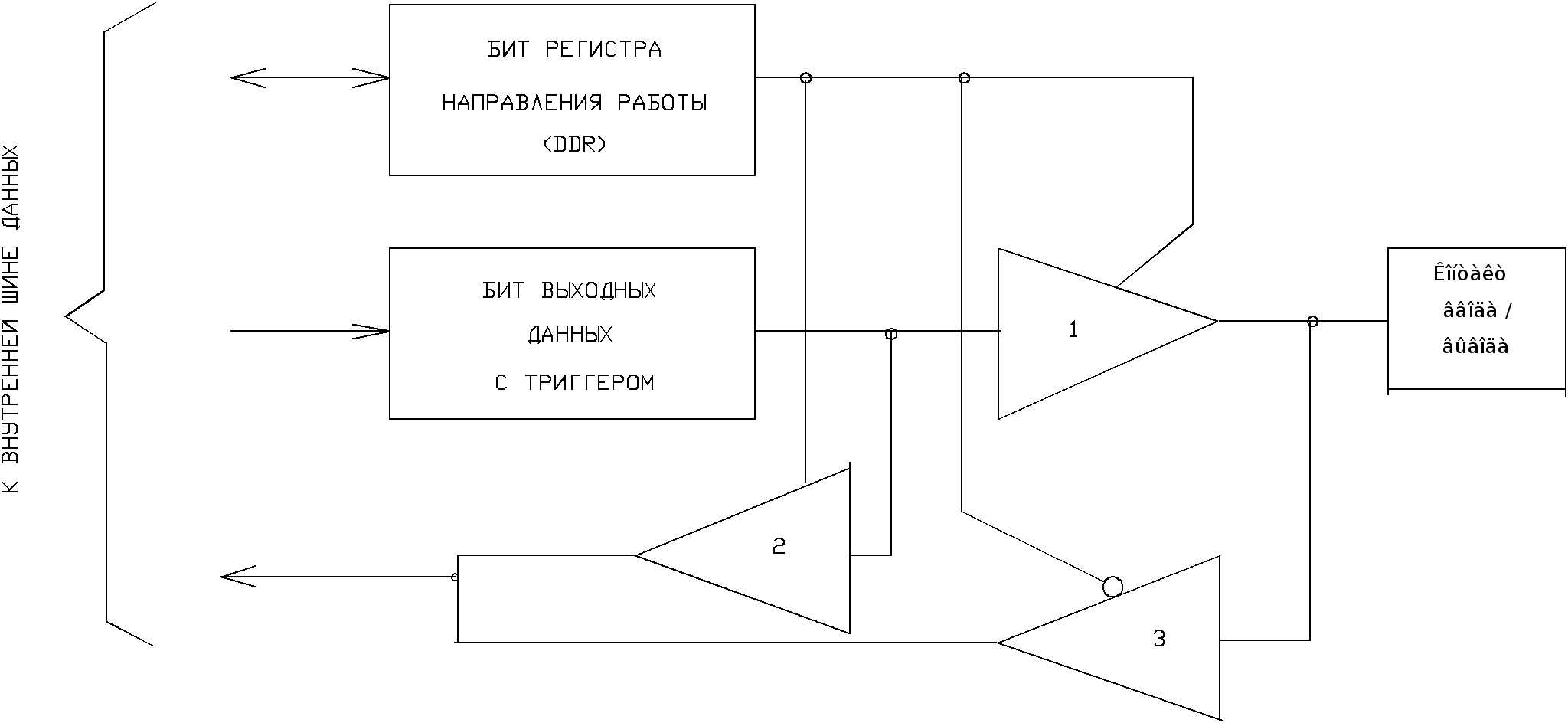 Ї Ї Ї Ї Ї Ї Ї Ї P7 P6 P5 P4 P3 P2 P1 P0 Контакты Рис. 2-1 Схема порта ввода/вывода. Канал настроен на вывод информации, если соответствующий бит в DDR установлен в 1. Если бит сброшен, то канал настроен на ввод (так предусмотрено при начальной установке). То есть разные каналы одного и того же порта могут быть настроены на ввод или вывод информации одновременно независимо друг от друга. На рис. 2-2 представлена структура канала параллельного порта, а в таблице 2-1 приведены различные режимы работы линии ввода-вывода. Таблица 2-1. Функции контактов ввода-вывода.